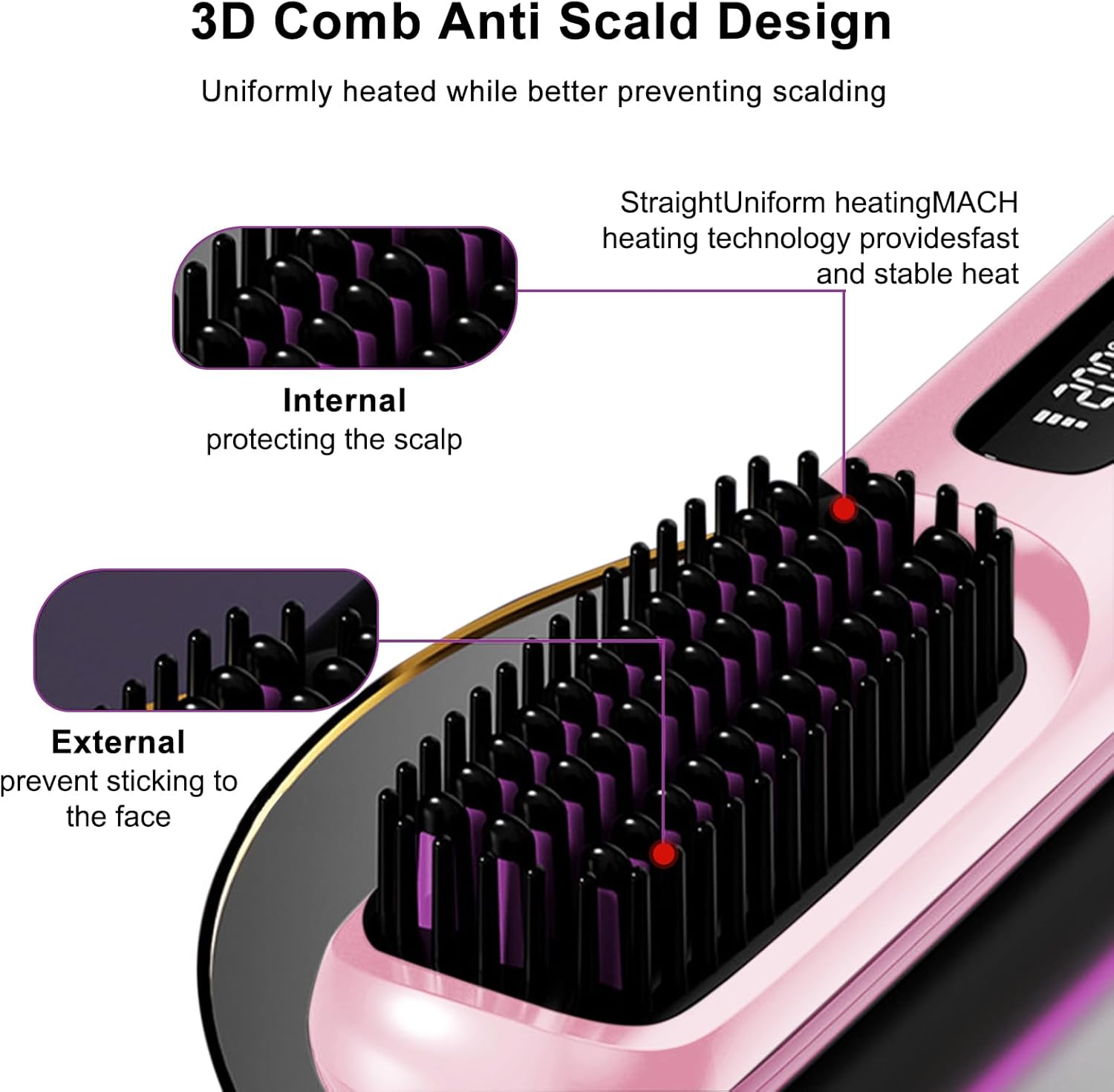 La sécurité est primordiale. La brosse à lisser est dotée de dents résistantes à la chaleur pour éviter les brûlures. Avec des réglages de chaleur adaptés, elle convient à tous les types et longueurs de cheveux, rendant l’expérience de coiffage agréable et sûre.