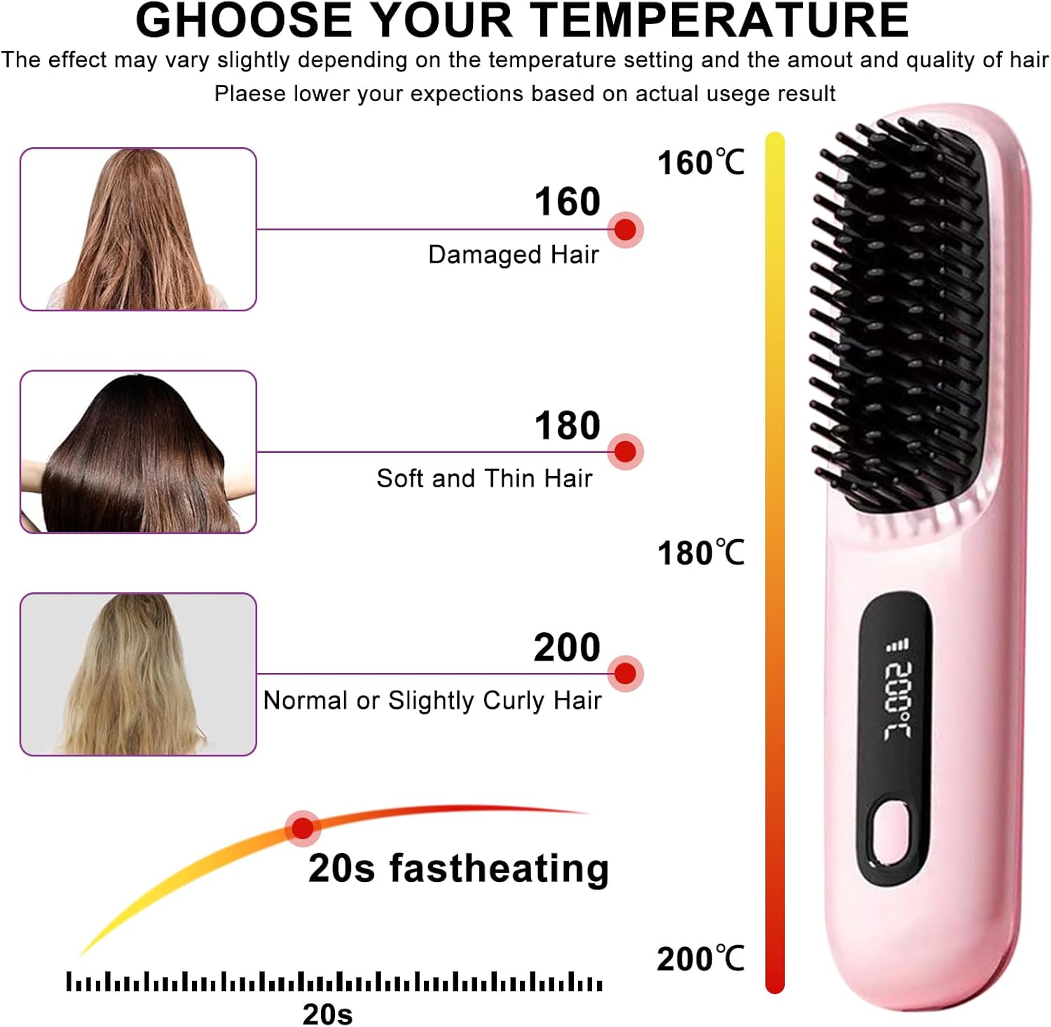- Températures réglables : Trois niveaux de chaleur adaptés à tous les types de cheveux (160 °C pour les cheveux fins, 180 °C pour les cheveux moyens, et 200 °C pour les cheveux épais) garantissent une personnalisation optimale.