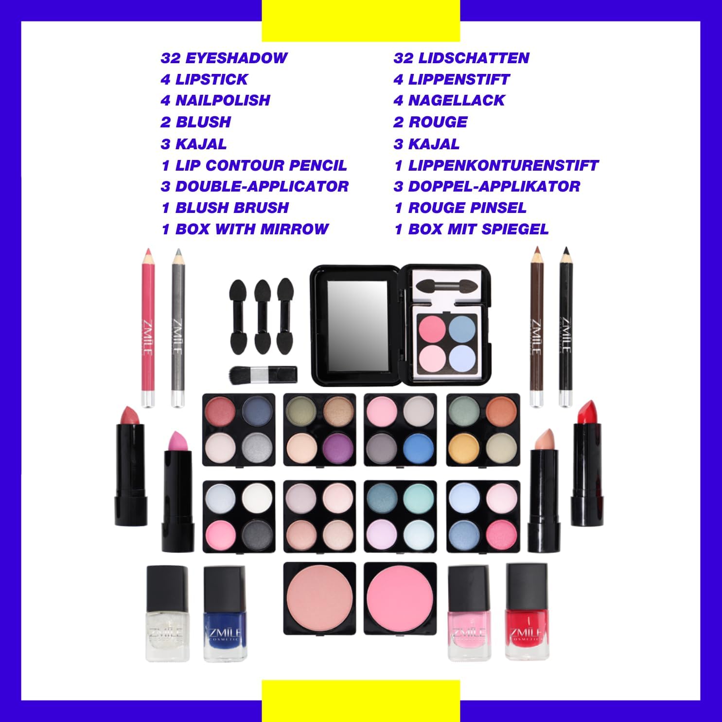 - Capacité généreuse : 51 pièces incluant 32 ombres à paupières, 4 rouges à lèvres, 4 vernis à ongles, 3 khôls, et plus encore.
