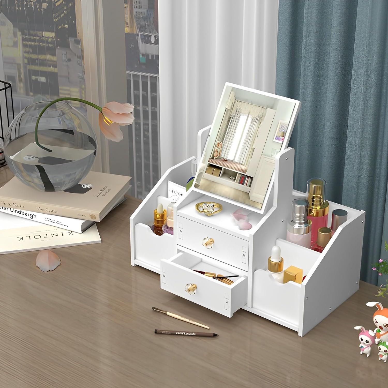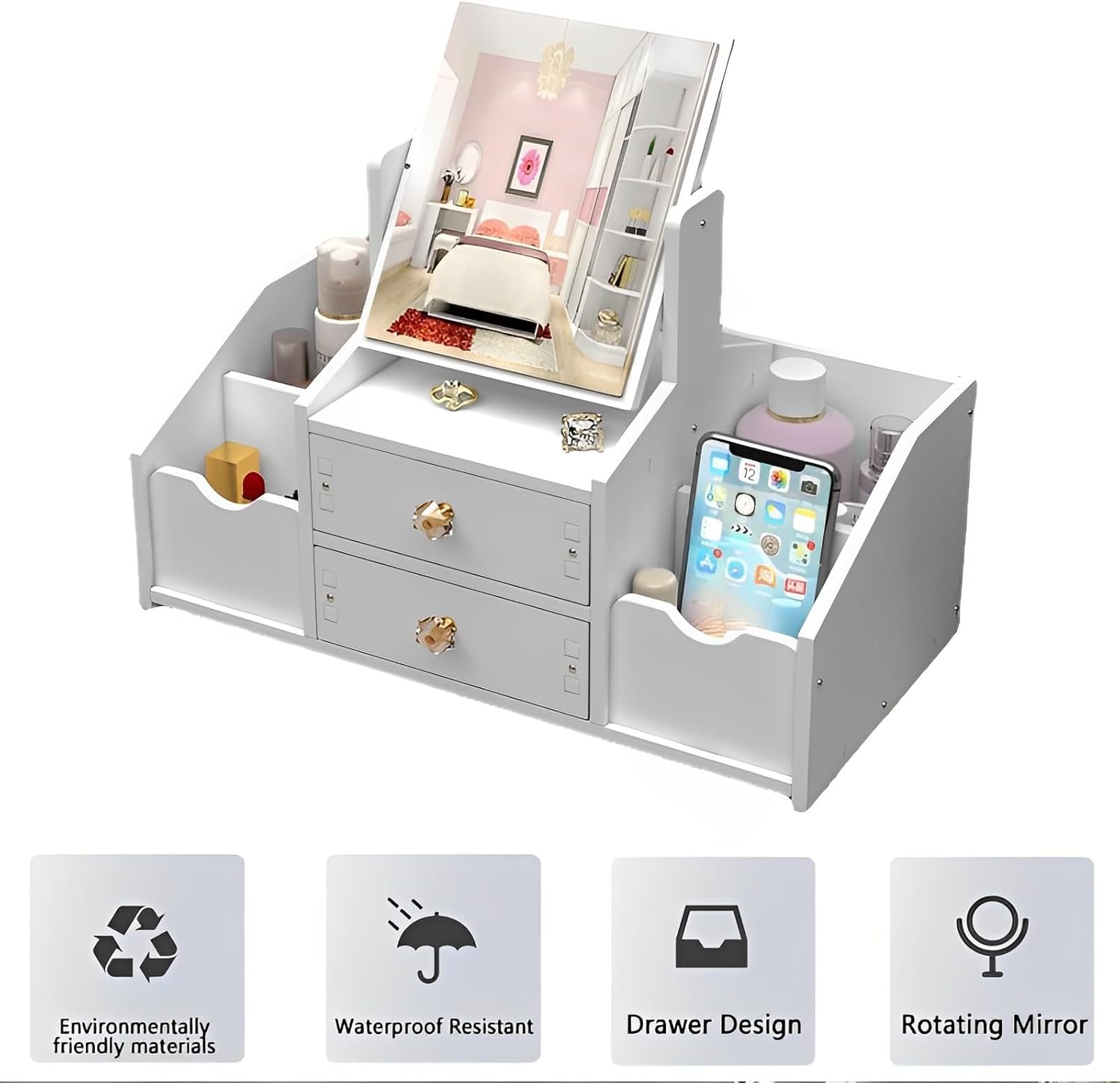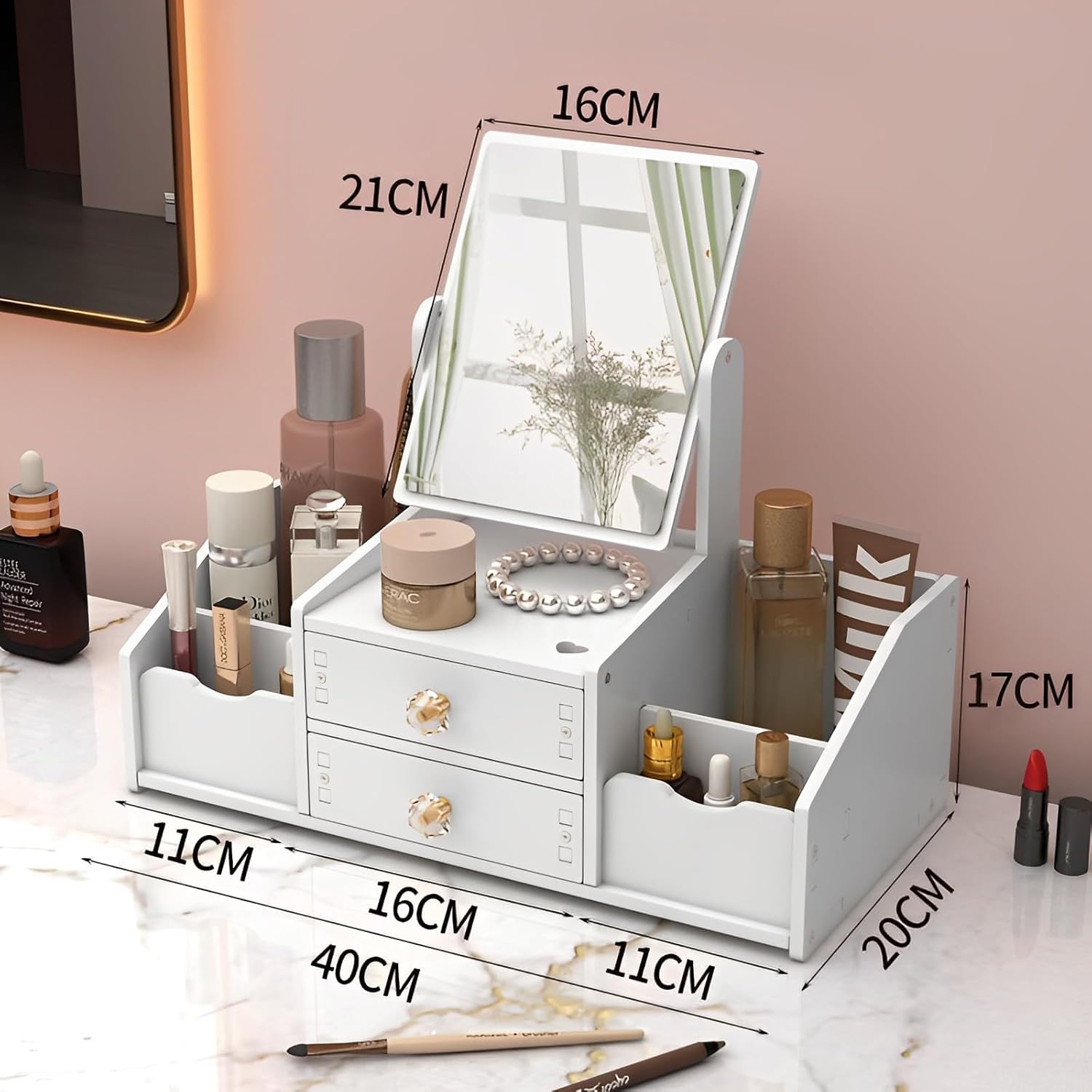 - Deux tiroirs spacieux pour ranger vos produits de beauté essentiels tels que fonds de teint, poudres et blushs.