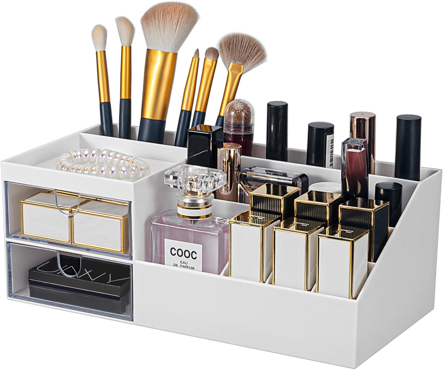 - Avec des tiroirs spacieux, cet organisateur de maquillage permet de ranger pinceaux, rouges à lèvres et plus encore.