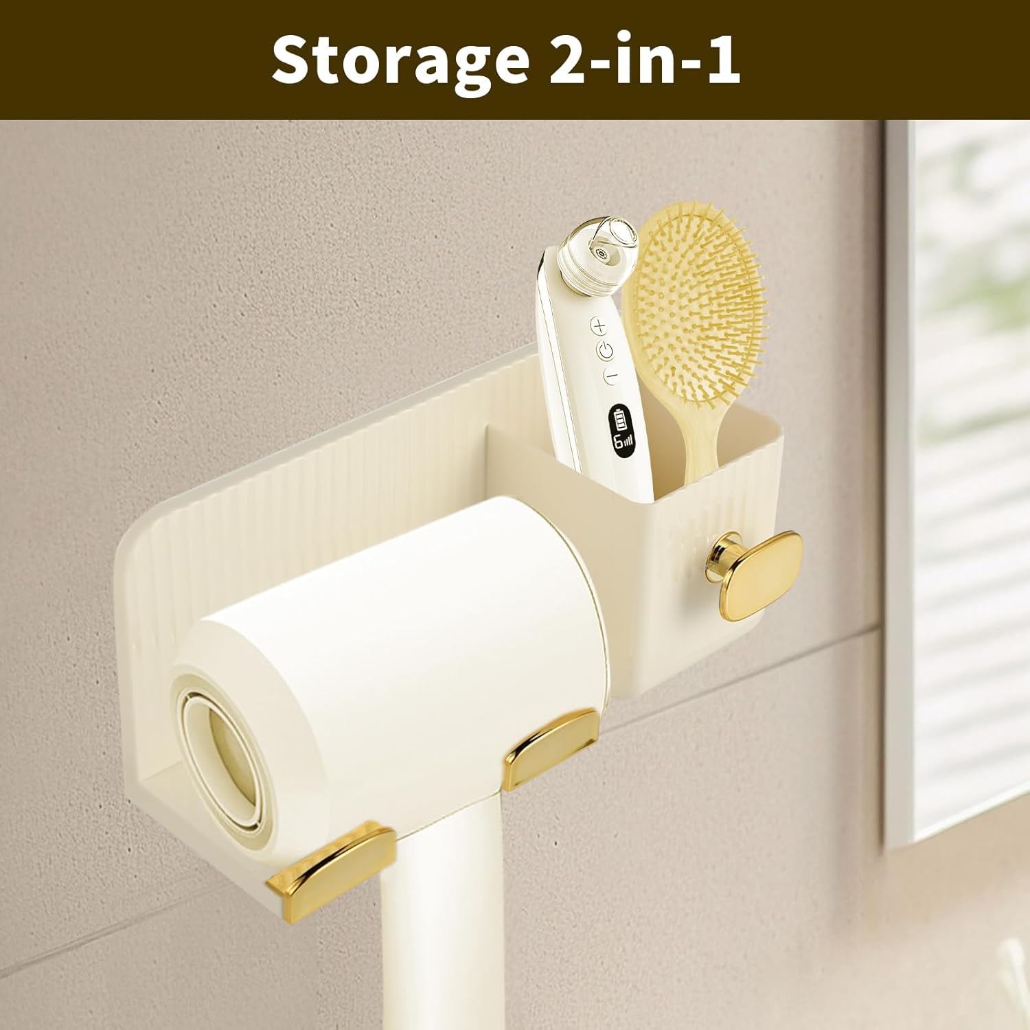 Porte sèche-cheveux mural en or crème : support élégant à deux compartiments pour un gain de place optimal