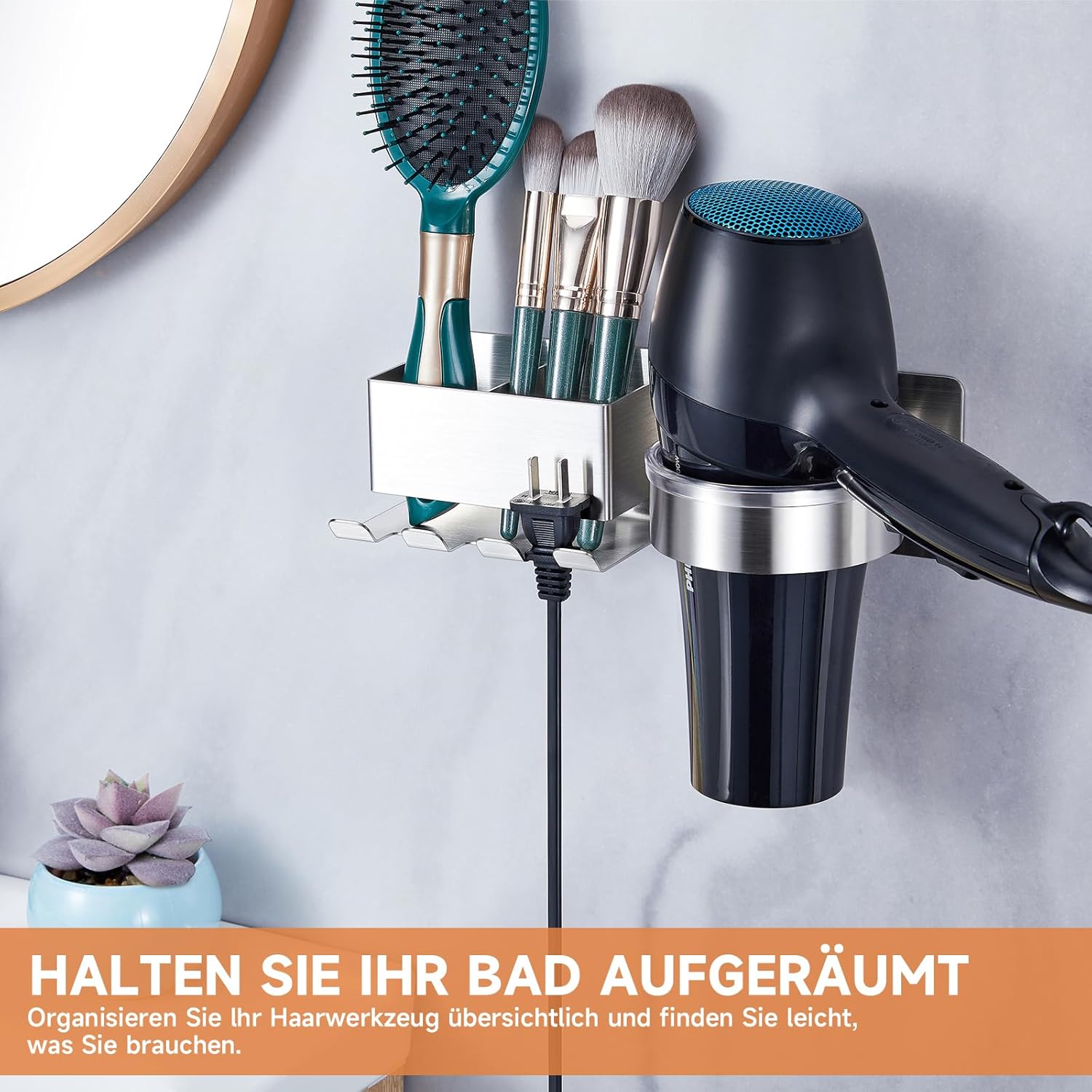- Support multifonctionnel : Dispose de deux compartiments pour ranger à la fois le sèche-cheveux et d’autres outils de coiffure, tout en gardant les câbles bien organisés.