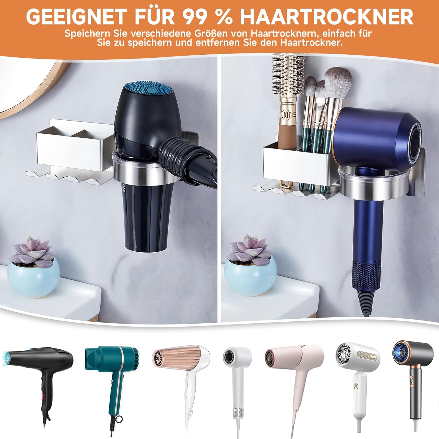 Ce support est conçu pour accueillir 99 % des modèles de sèche-cheveux disponibles sur le marché, garantissant une compatibilité maximale. L’insertion et le retrait deviennent ainsi simples et rapides, facilitant votre quotidien.