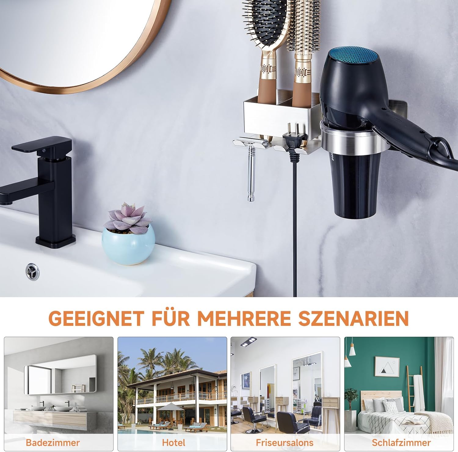 Ce support polyvalent trouve sa place dans divers environnements, que ce soit dans une chambre, une salle de bain, un appartement, un dortoir, une caravane ou même un salon de coiffure. Il permet de garder vos outils de coiffage organisés tout en maintenant une salle de bain propre et bien rangée.