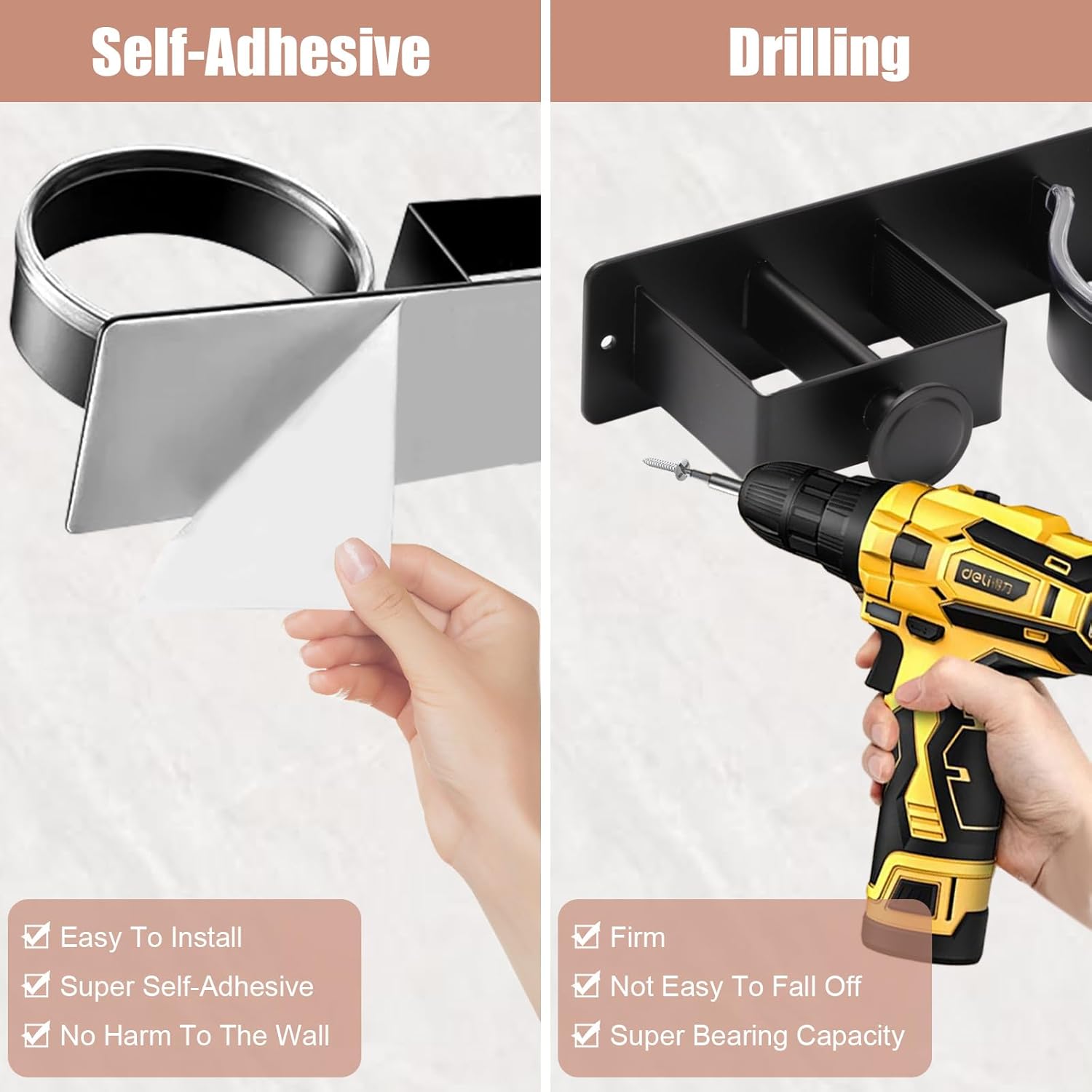 Réponse : Oui, le porte sèche-cheveux mural utilise une bande autocollante avec une grande capacité de charge, garantissant qu’il ne tombera pas et n’endommagera pas votre mur. - Question : Est-ce que ce support est compatible avec tous les sèche-cheveux ?