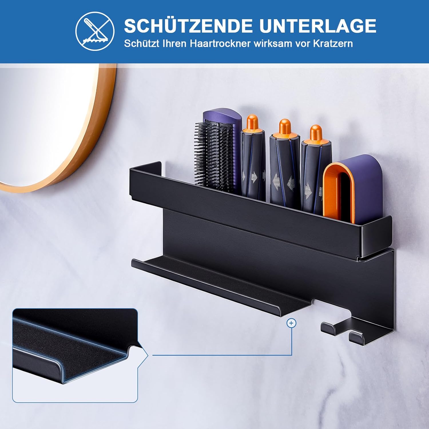 Réponse : Absolument, il est équipé d’un coussin de protection qui empêche le sèche-cheveux d’être rayé par friction. - Question : Peut-on ranger d’autres accessoires avec le support ?