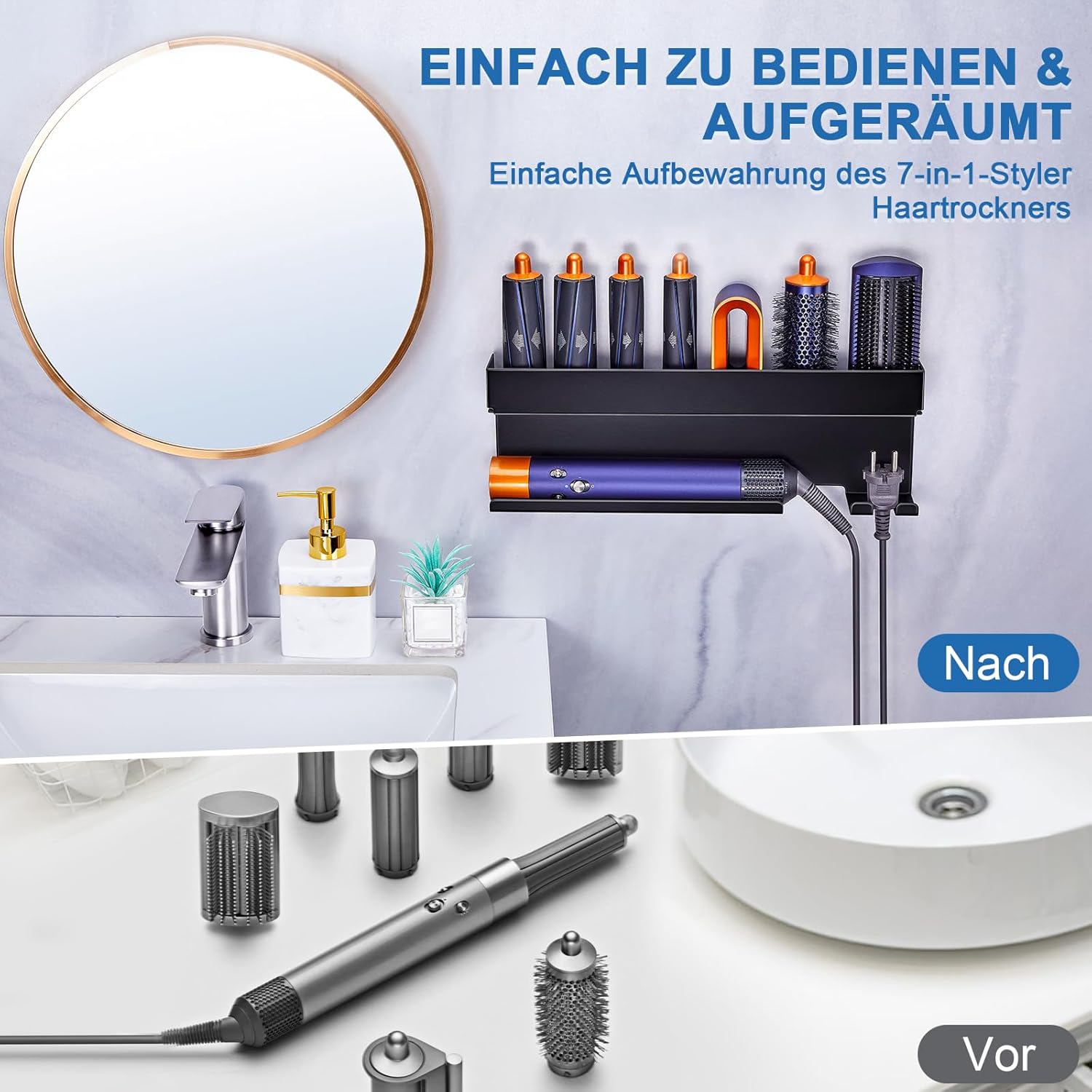 - Le rangement multifonctionnel permet de stocker non seulement le sèche-cheveux, mais aussi des accessoires comme des brosses et des produits de soin.