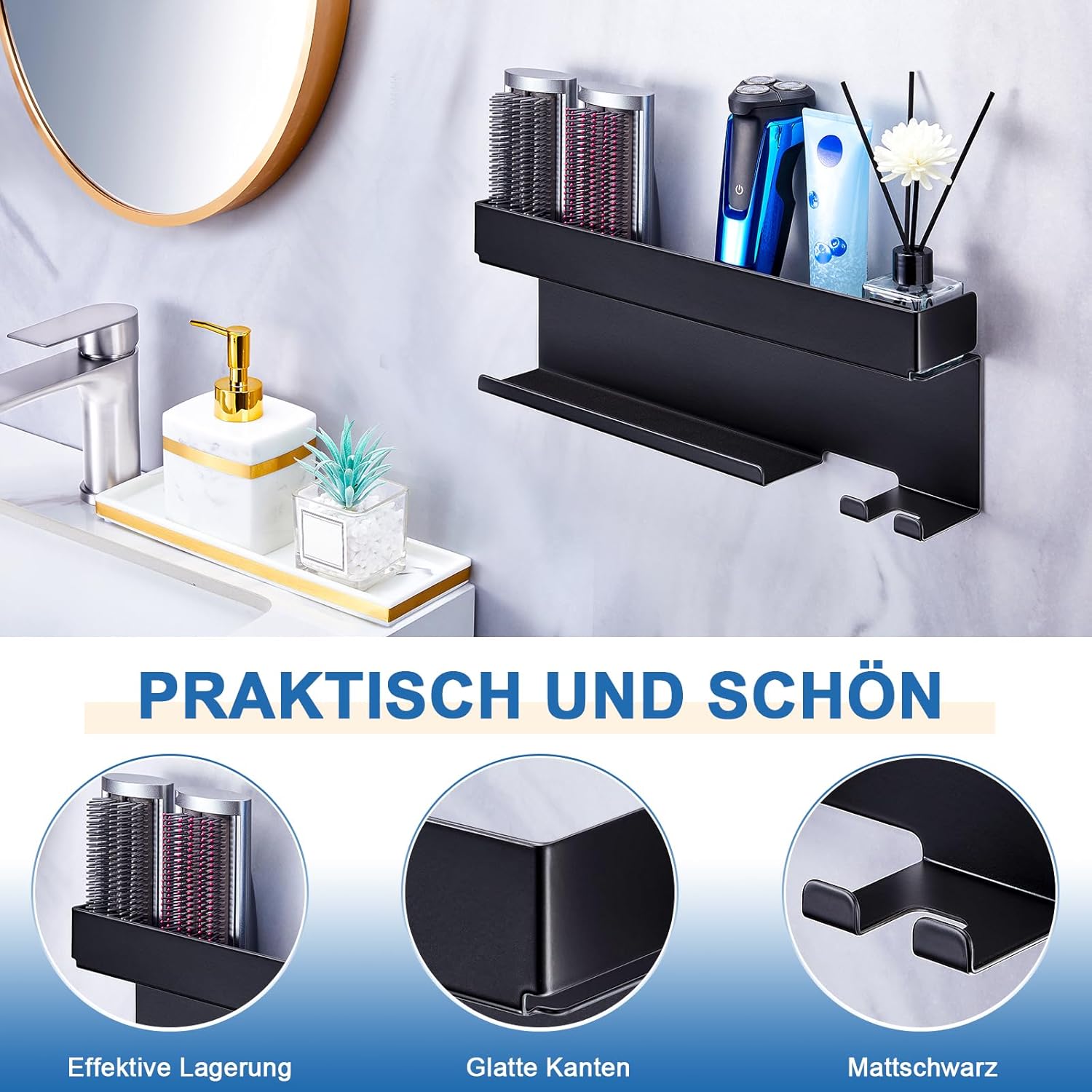 Réponse : Oui, le support multifonctionnel permet de stocker des outils de coiffure, des produits de soins et d’autres essentiels au quotidien.