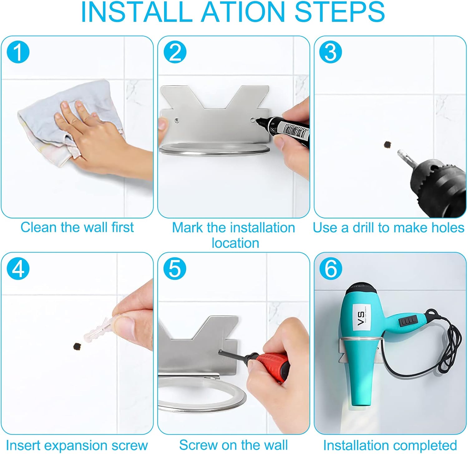 Réponse : Oui, avec un diamètre intérieur de 7,3 cm, il convient à la plupart des sèche-cheveux et peut également accueillir d’autres accessoires de salle de bain. - Question : Quelle est la méthode d’installation du support ?