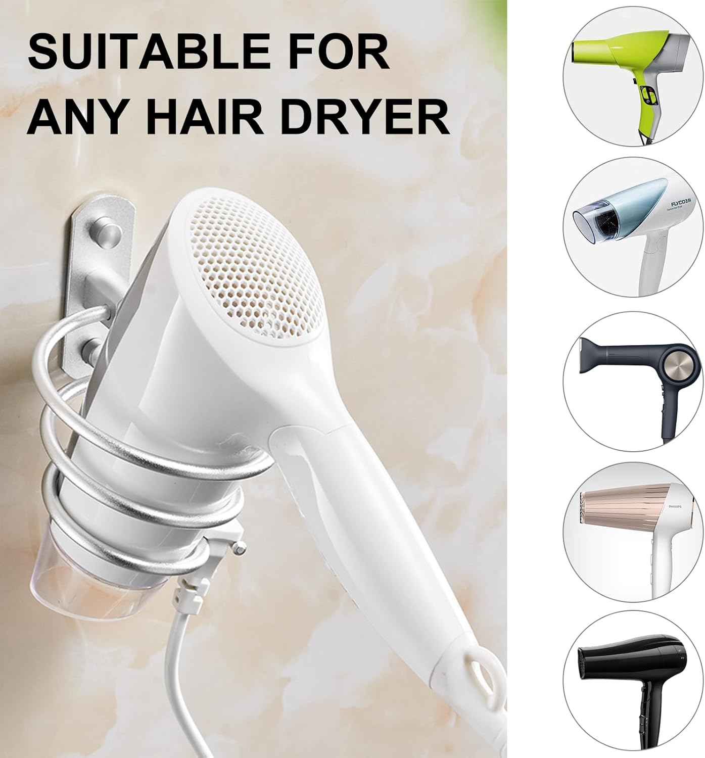 Réponse : Ce support permet de ranger votre sèche-cheveux de manière ordonnée, réduisant ainsi l’encombrement dans votre salle de bain et créant plus d’espace de travail. - Question : Puis-je utiliser ce support pour d’autres appareils de coiffure ?