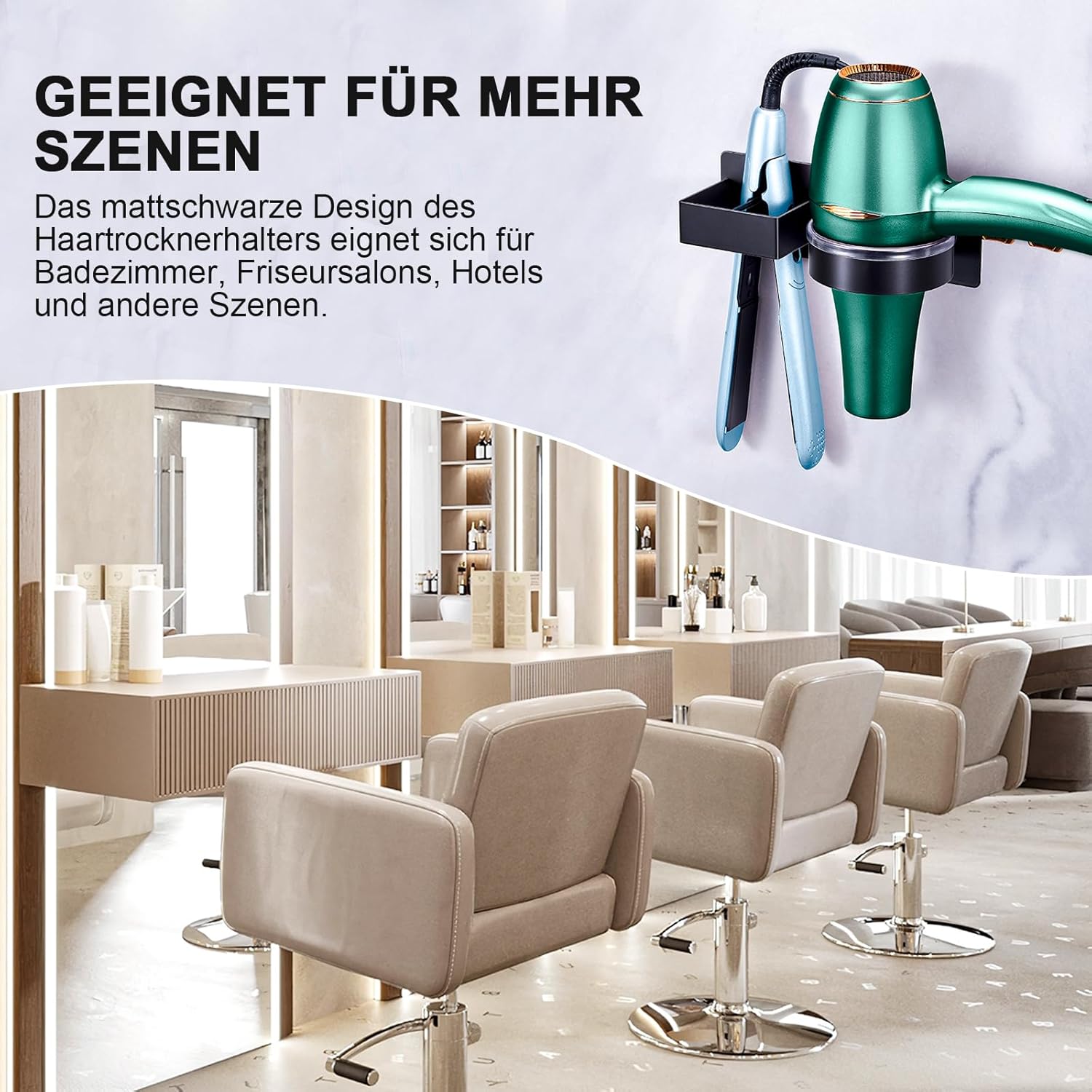 Réponse : Oui, le porte sèche-cheveux présente un design élégant et minimaliste qui s’intègre parfaitement dans tout type d’intérieur, que ce soit dans une chambre, une salle de bains ou un salon de coiffure.