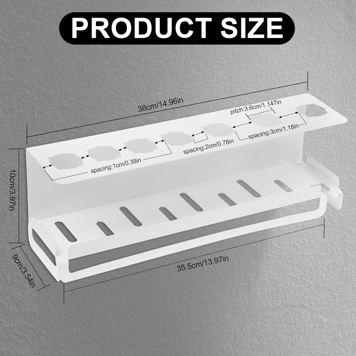 Réponse : Le support mesure 38 x 9 x 10 cm, offrant un espace suffisant pour ranger votre sèche-cheveux et ses accessoires. - Question : Est-ce que ce support est idéal pour les salles de bain ?