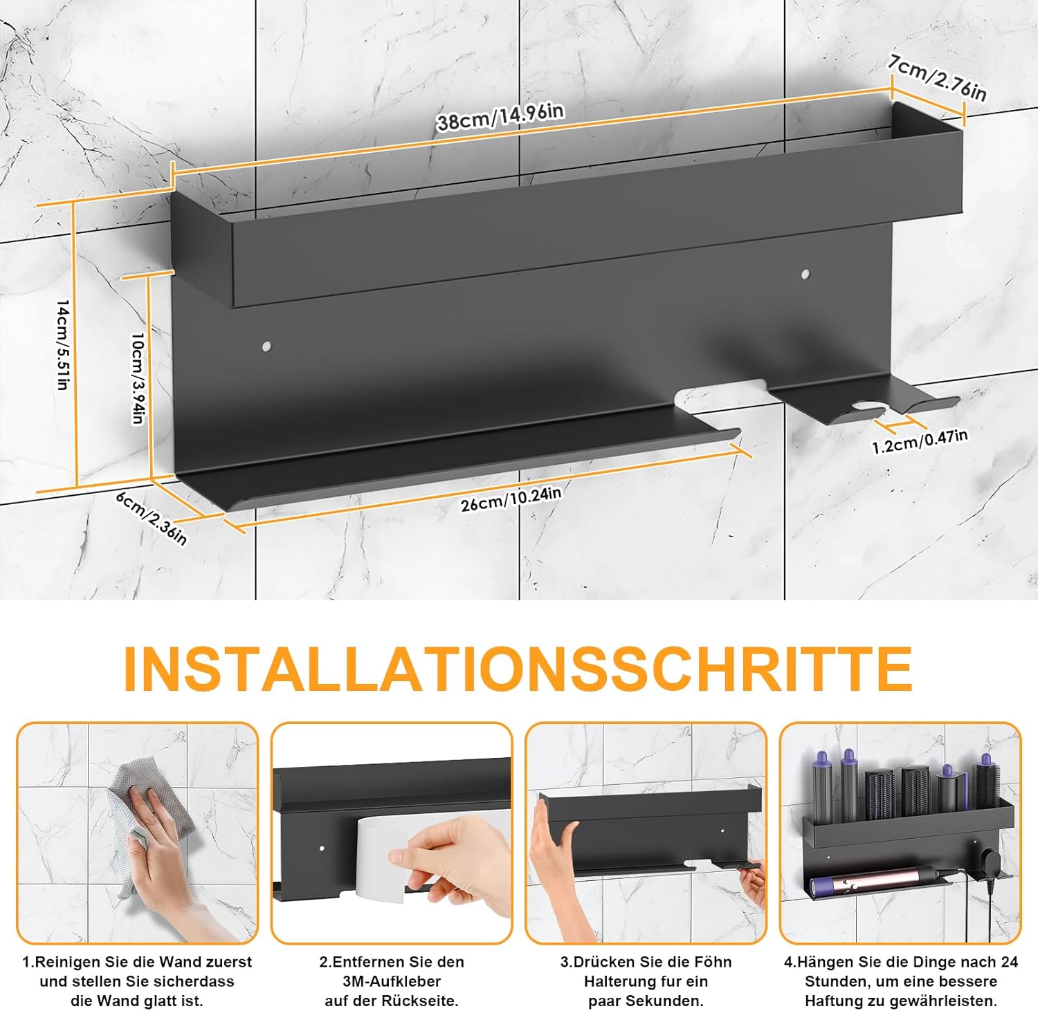 Le support mural de rangement est dimensionné pour s’adapter à tous vos appareils (L x l x H : 38 cm x 7 cm x 14 cm). En cas de problème, un service client réactif est prêt à résoudre toute difficulté dans les 24 heures.