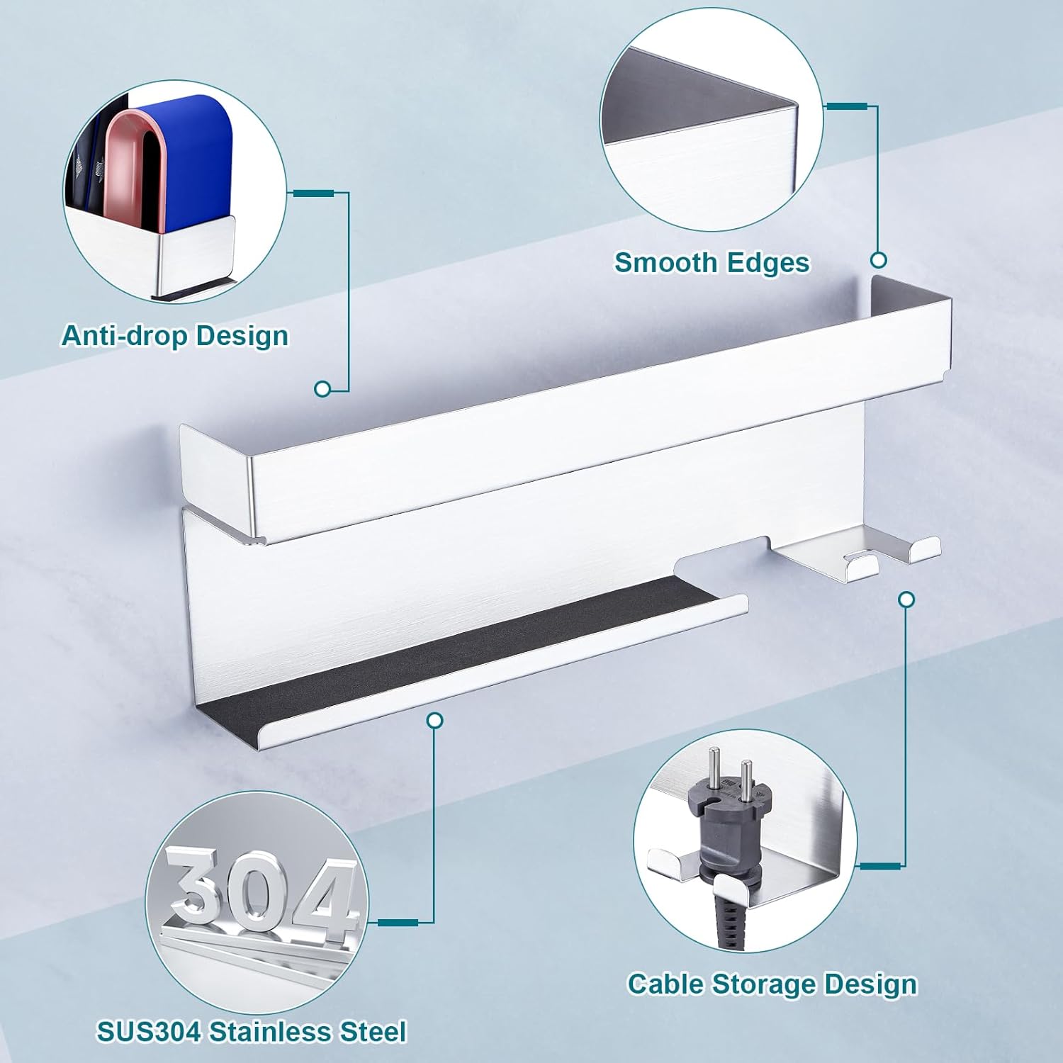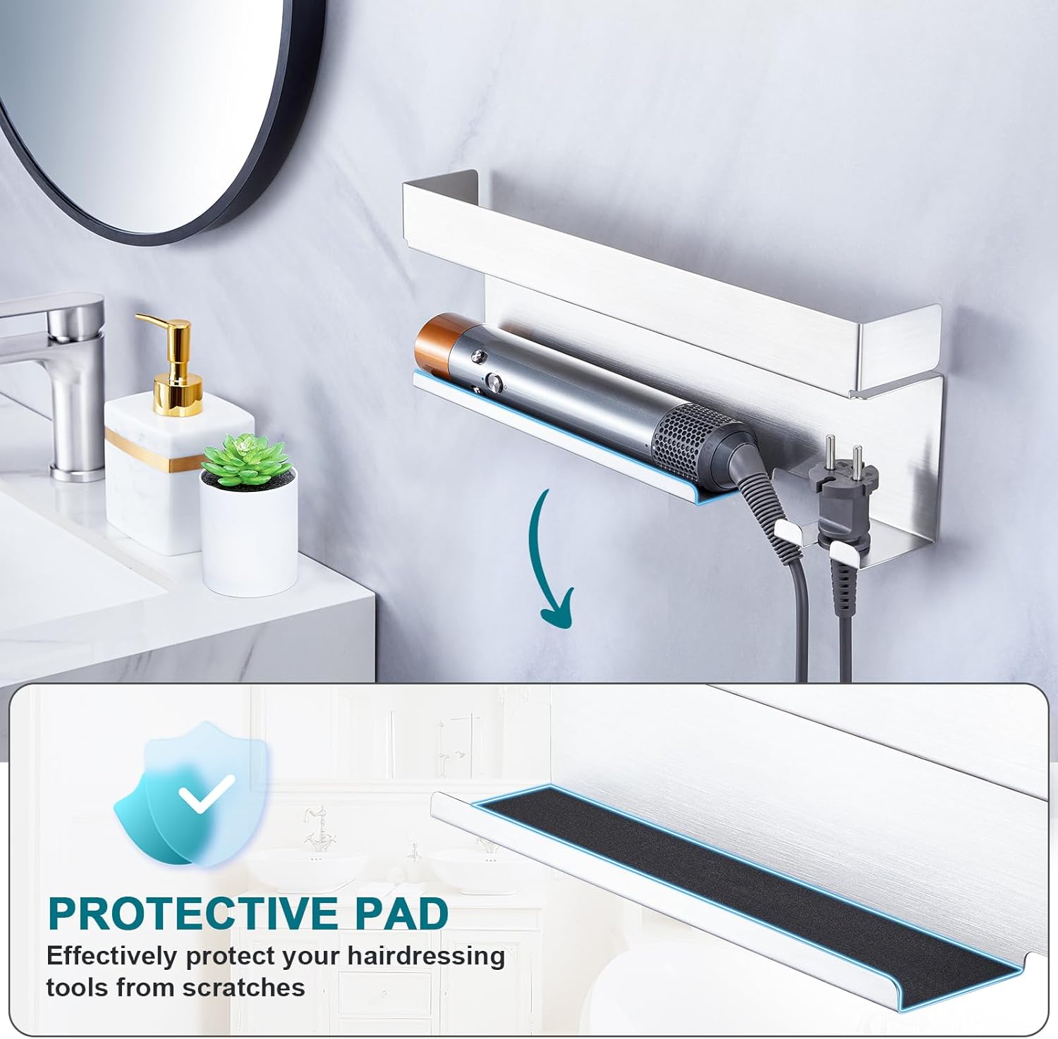 Réponse : Oui, fabriqué en acier inoxydable, le support résiste à la chaleur, ce qui protège vos outils de coiffure lors du rangement. - Question : Est-ce que le support convient à tous les types de murs ?