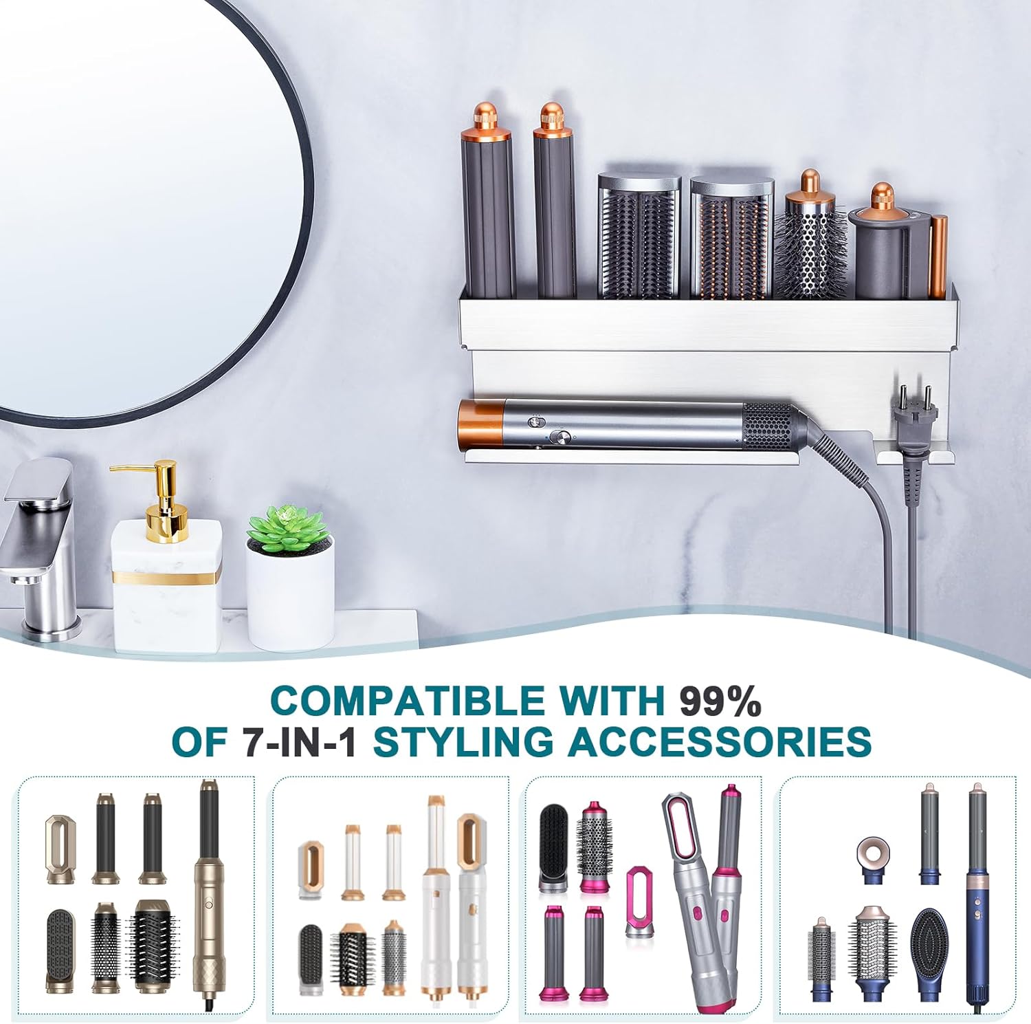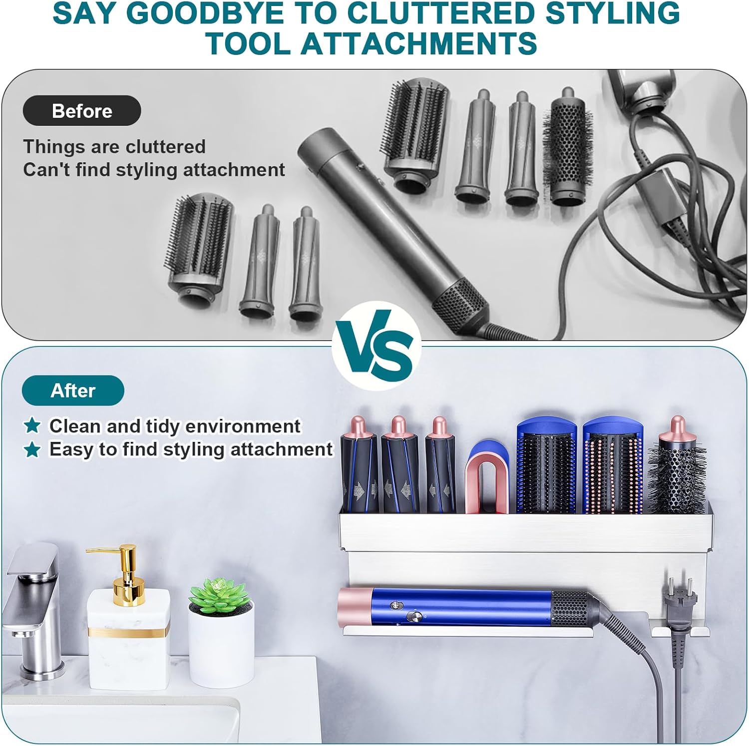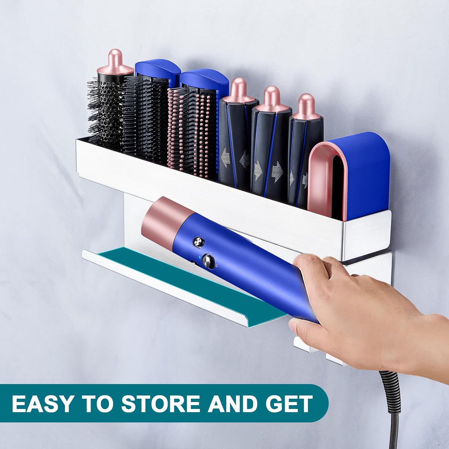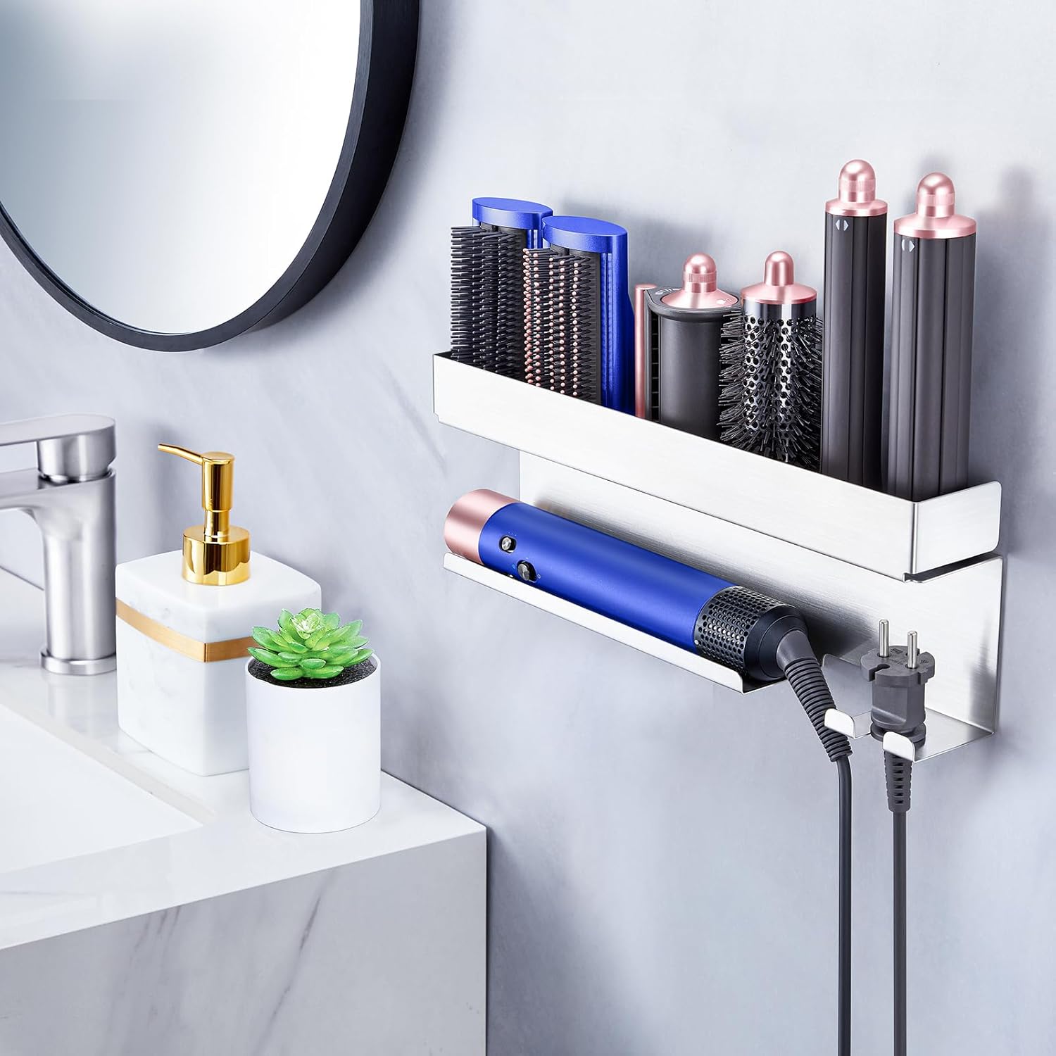 - Le support offre un rangement polyvalent pour tous vos outils de coiffure, incluant sèche-cheveux et fers à friser.