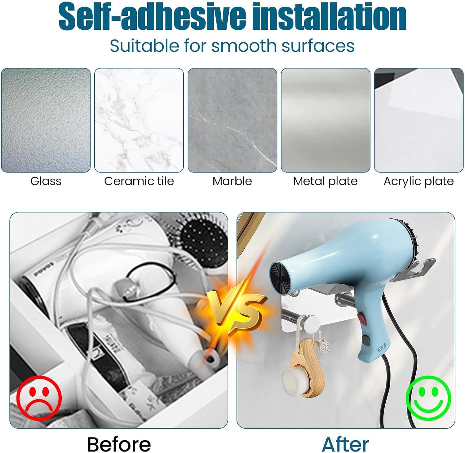 - Conception ergonomique : la fente maintient le sèche-cheveux en position verticale, évitant tout risque de chute.