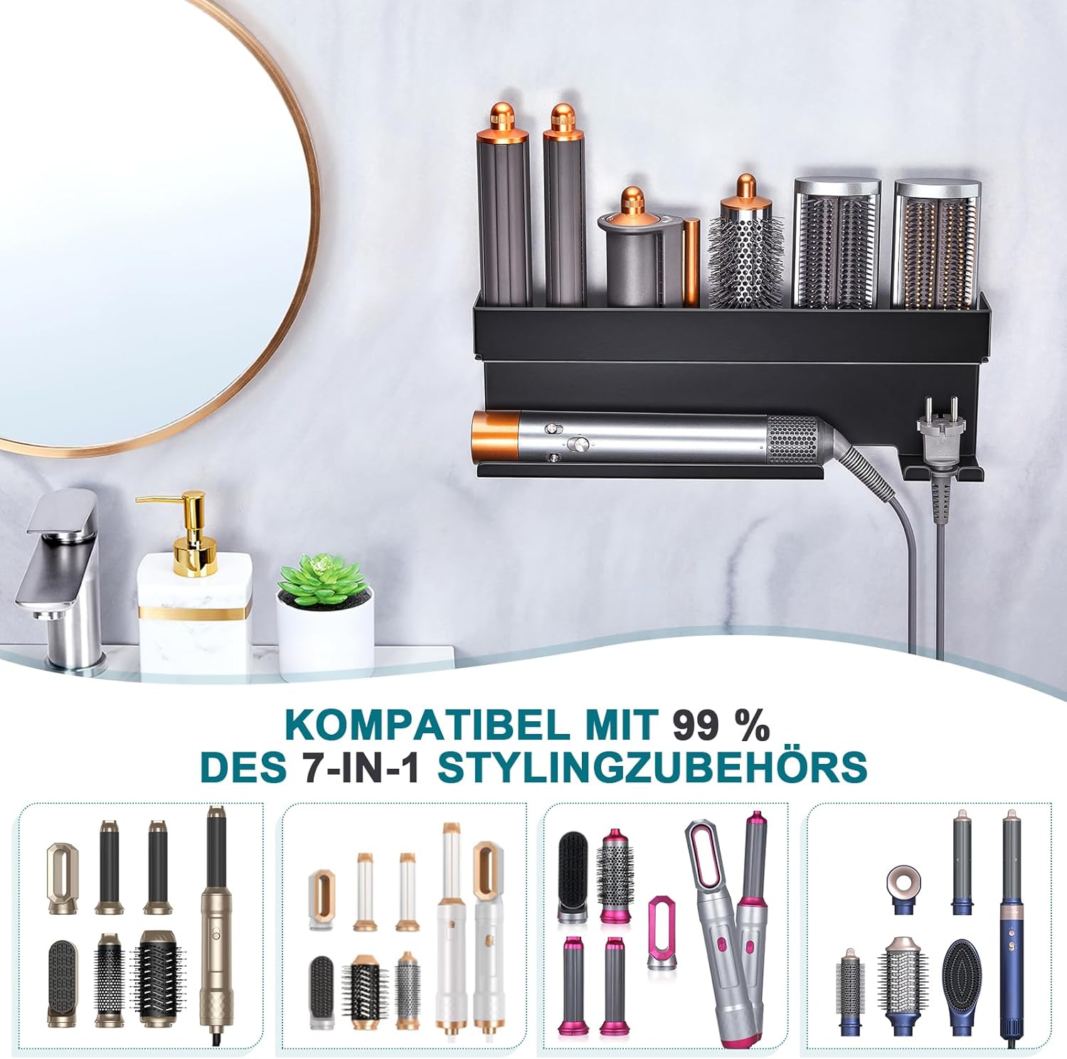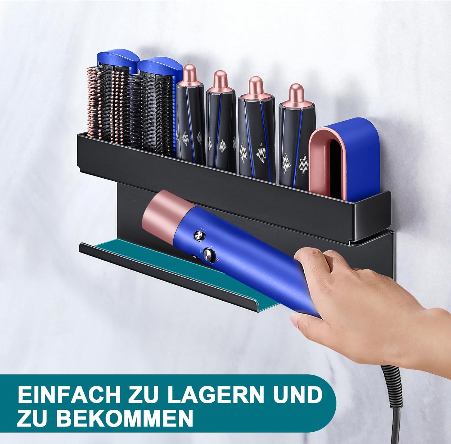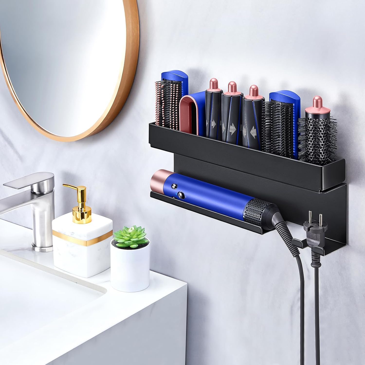 - Rangement efficace : Le support est conçu pour accueillir tous vos accessoires de sèche-cheveux, gardant votre espace ordonné.