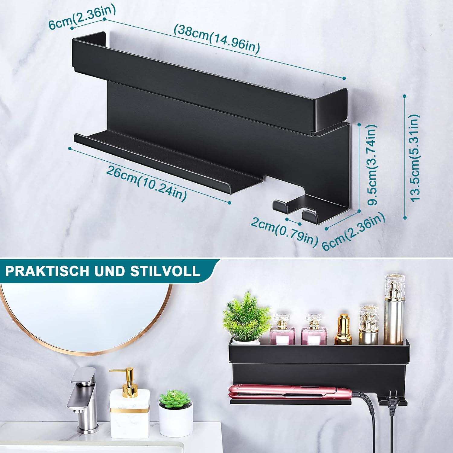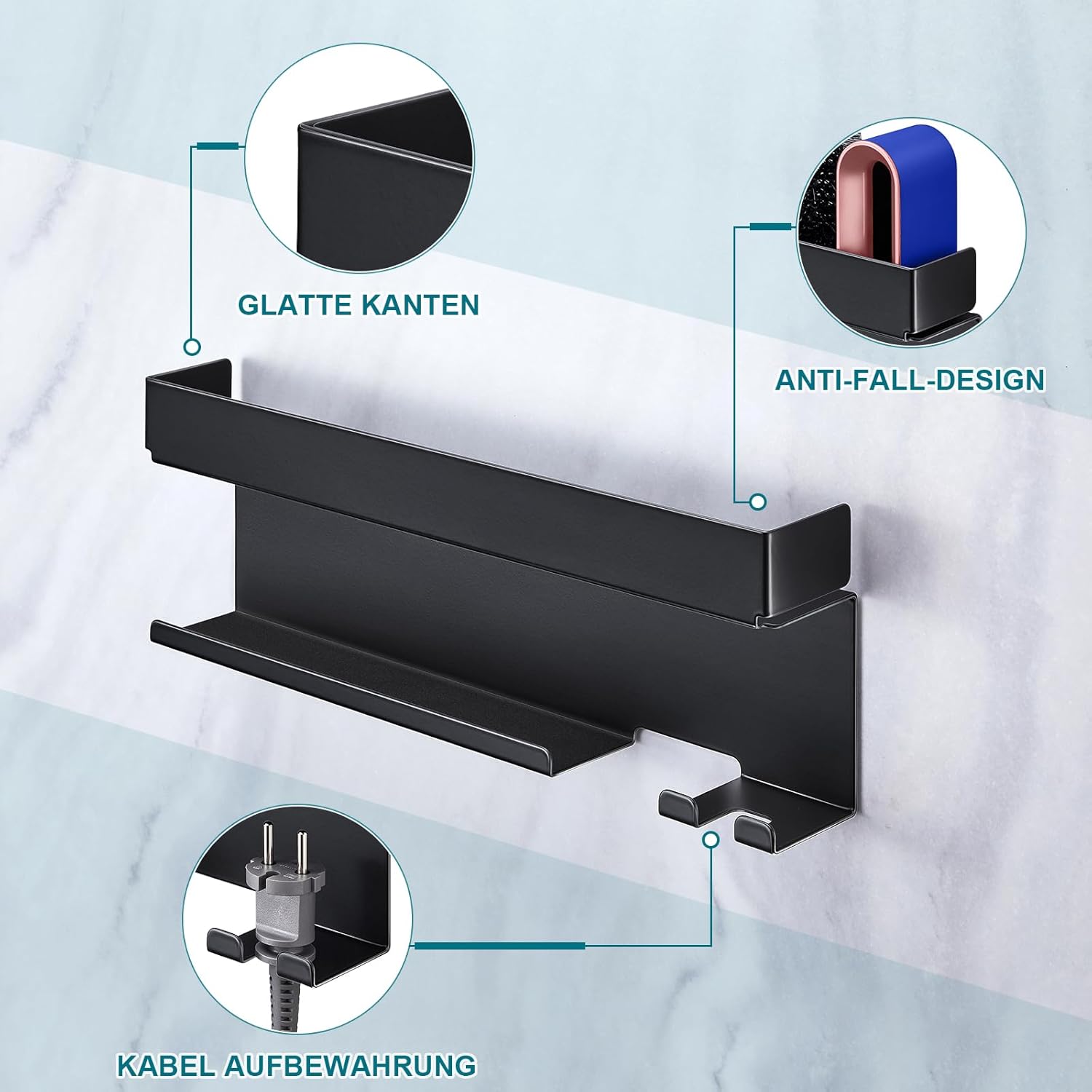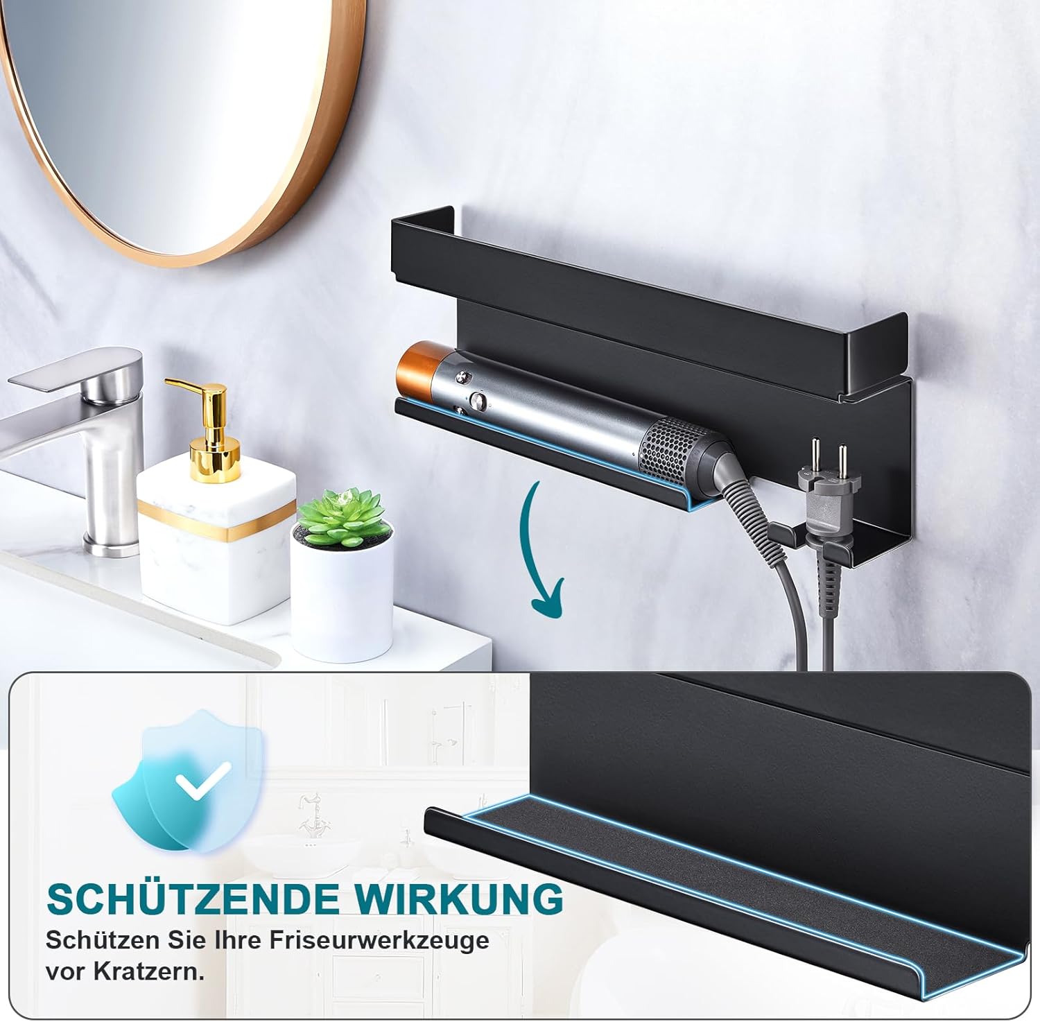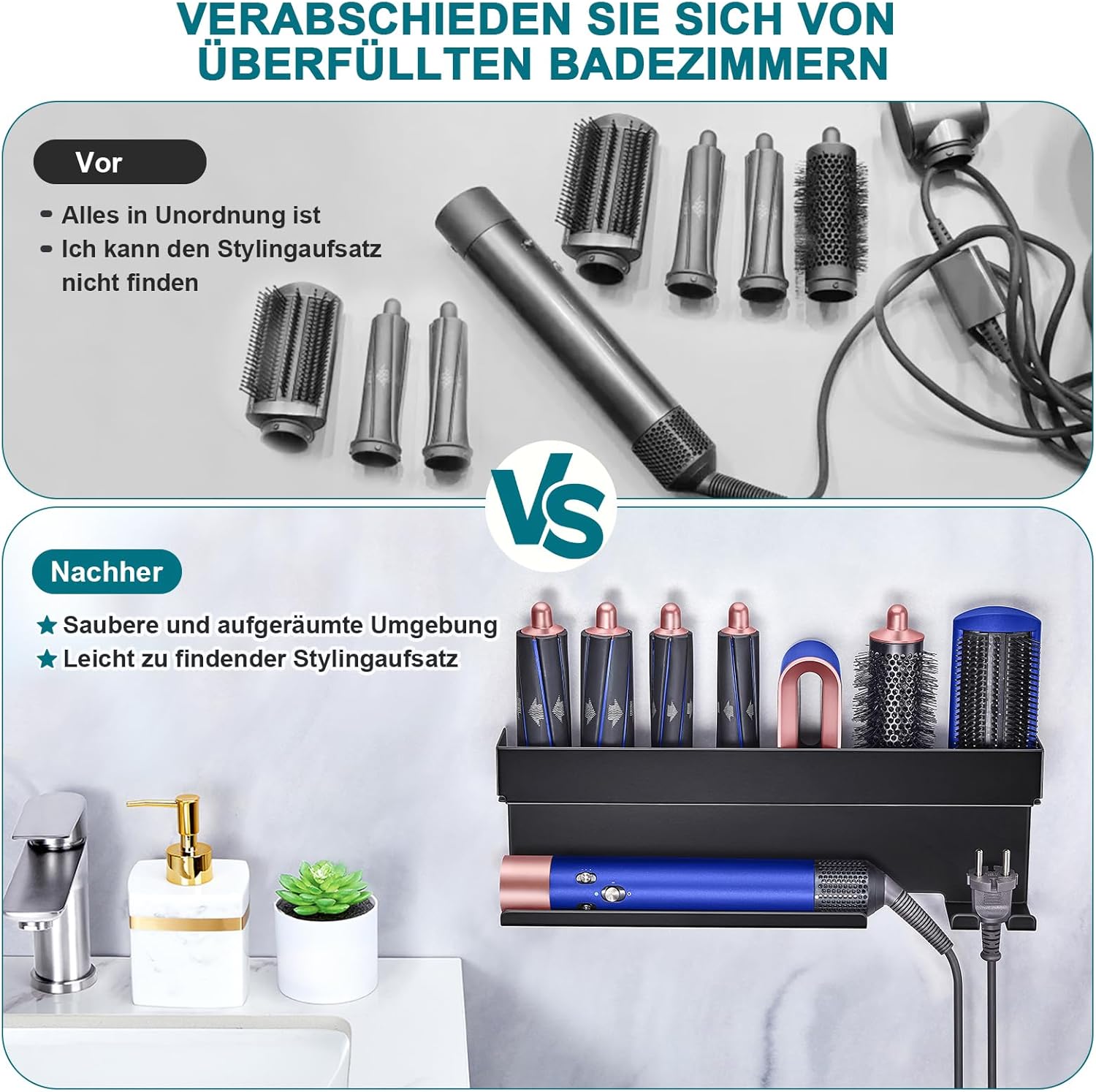 - Rangement efficace : Le support est conçu pour accueillir tous vos accessoires de sèche-cheveux, gardant votre espace ordonné.