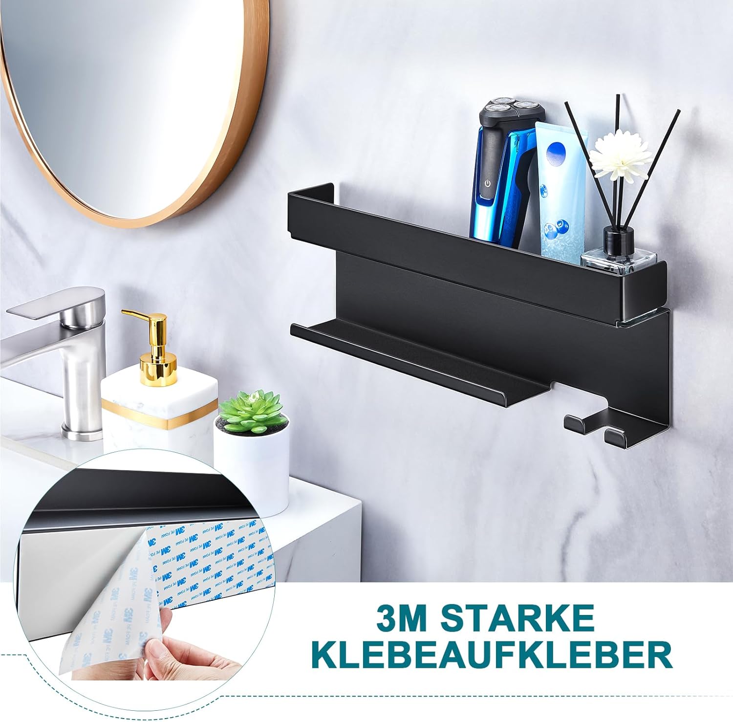 Le support mesure 38 x 14 x 7 cm, parfait pour optimiser l’espace dans votre salle de bain.