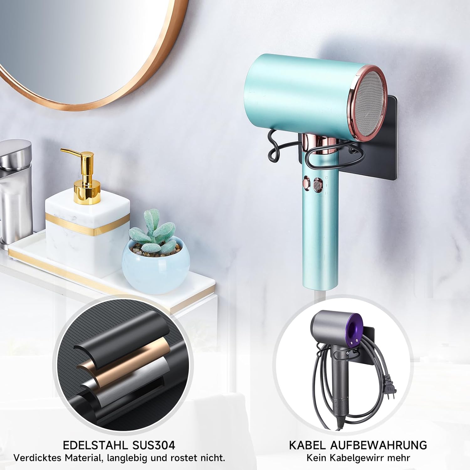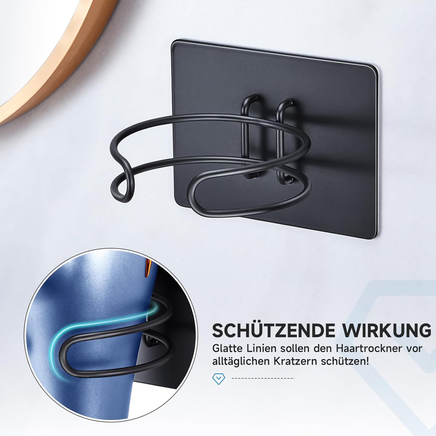 Le support de sèche-cheveux est non seulement esthétiquement plaisant, mais il est également conçu pour préserver la surface de votre appareil. Les lignes lisses évitent tout frottement, protégeant ainsi votre sèche-cheveux des rayures. De plus, sa conception murale permet de libérer de l’espace précieux sur le plan de travail.