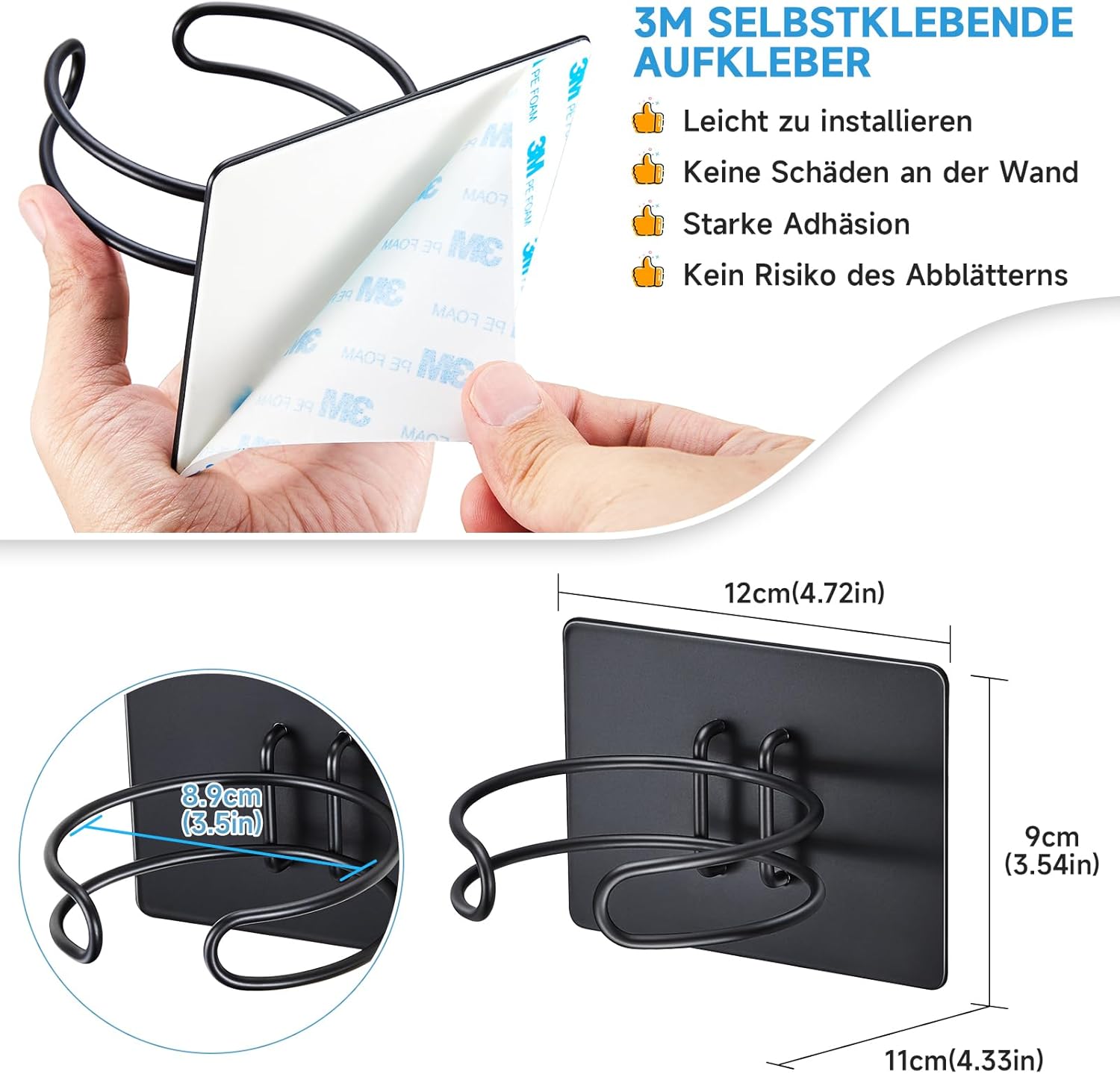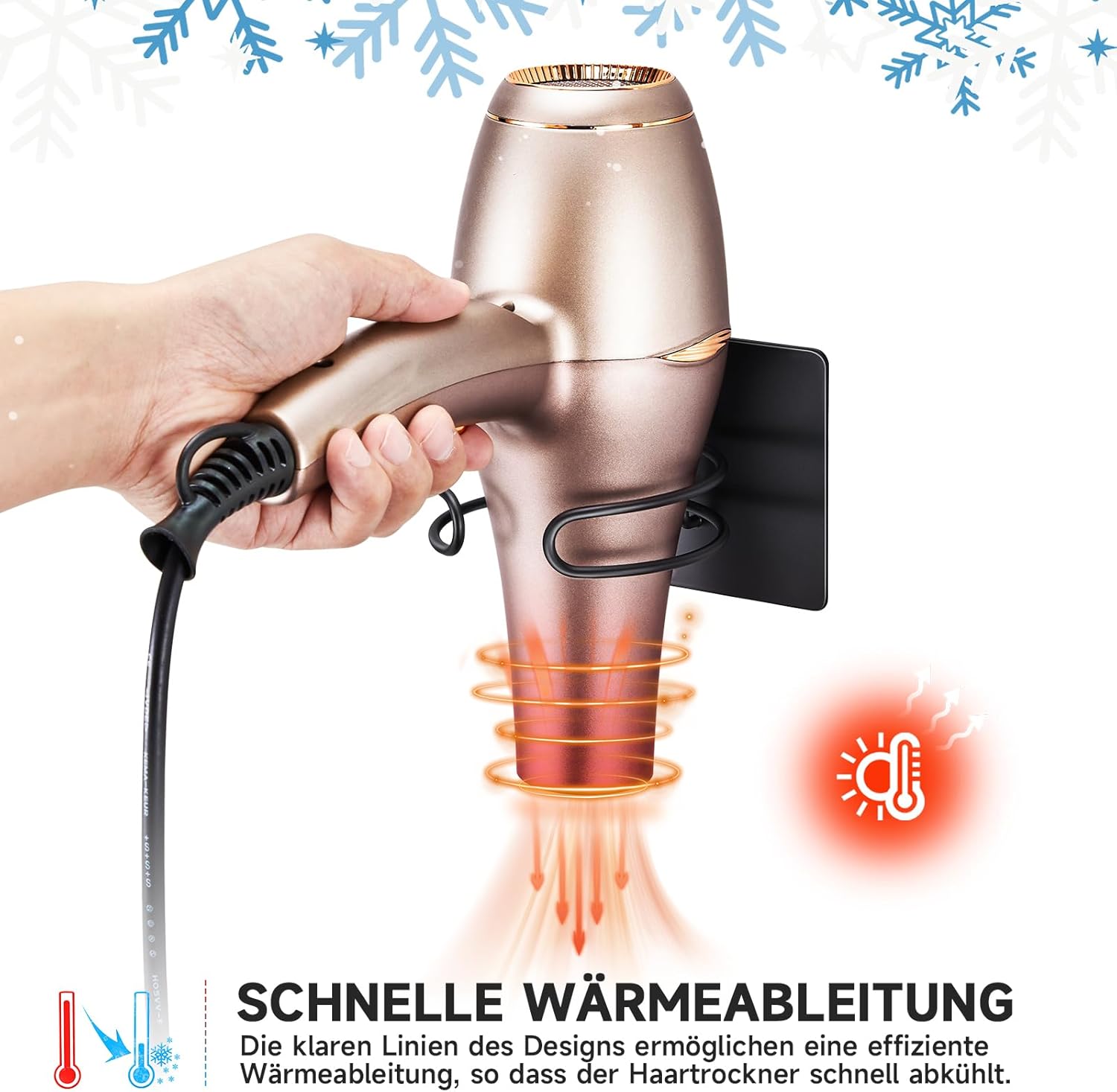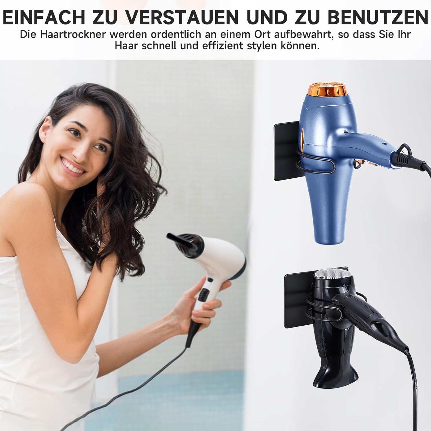 Le support de sèche-cheveux se distingue par son design en boucle épuré, qui non seulement embellit votre salle de bain, mais assure également une dissipation rapide de la chaleur. Son aspect noir mat s’intègre parfaitement à une multitude de styles, qu’ils soient contemporains ou classiques.