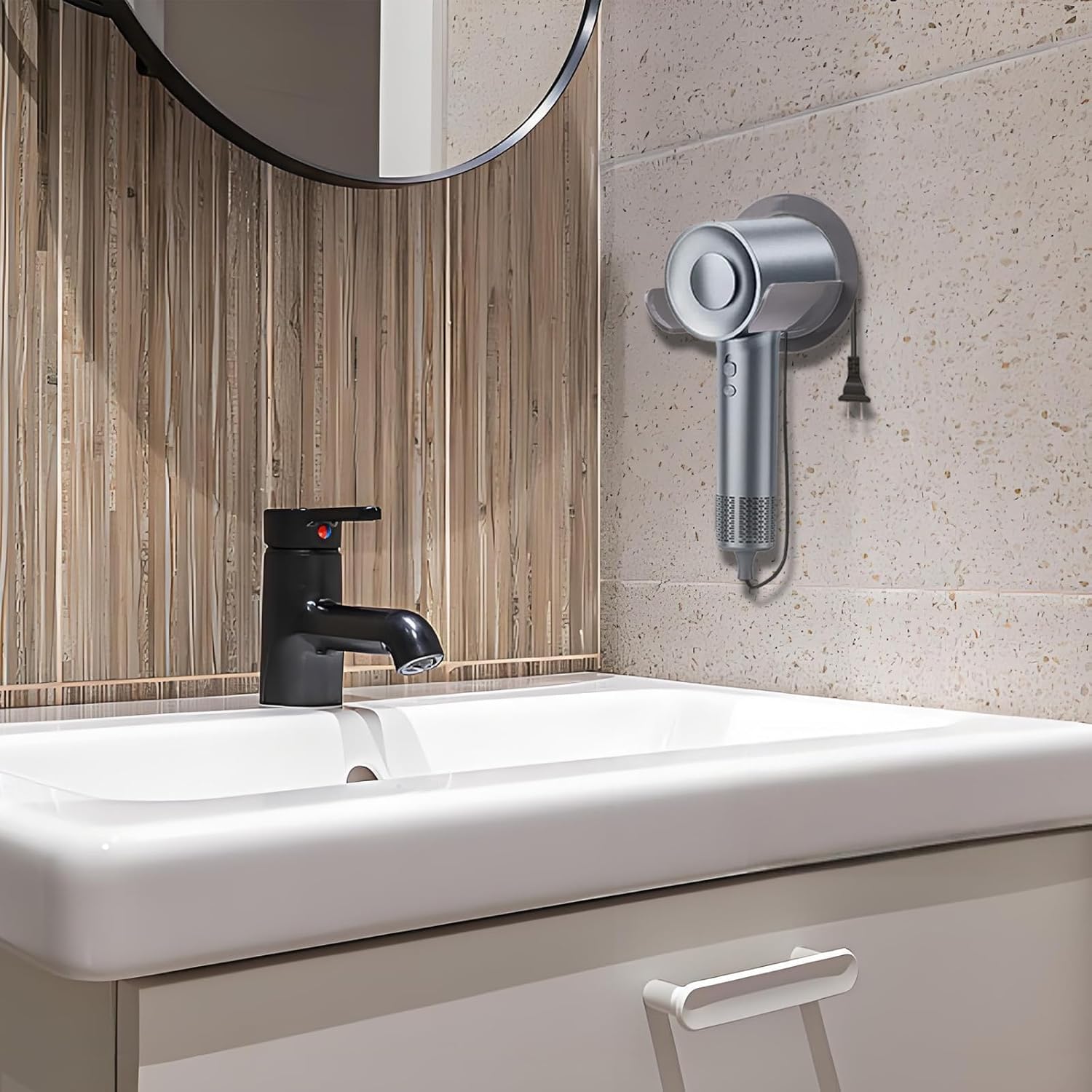 Réponse : Oui, ce support pour sèche-cheveux convient à la plupart des modèles de sèche-cheveux cylindriques et même à certains fers à lisser. - Question : Comment gérer les câbles du sèche-cheveux avec ce support ?