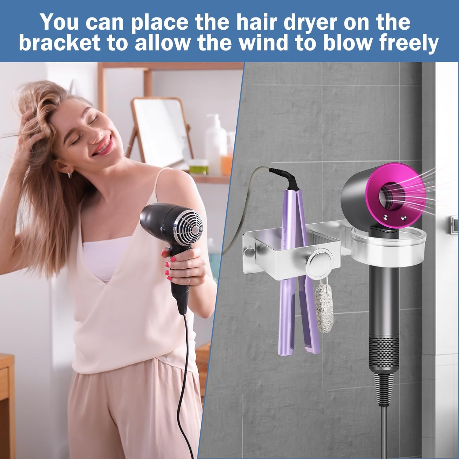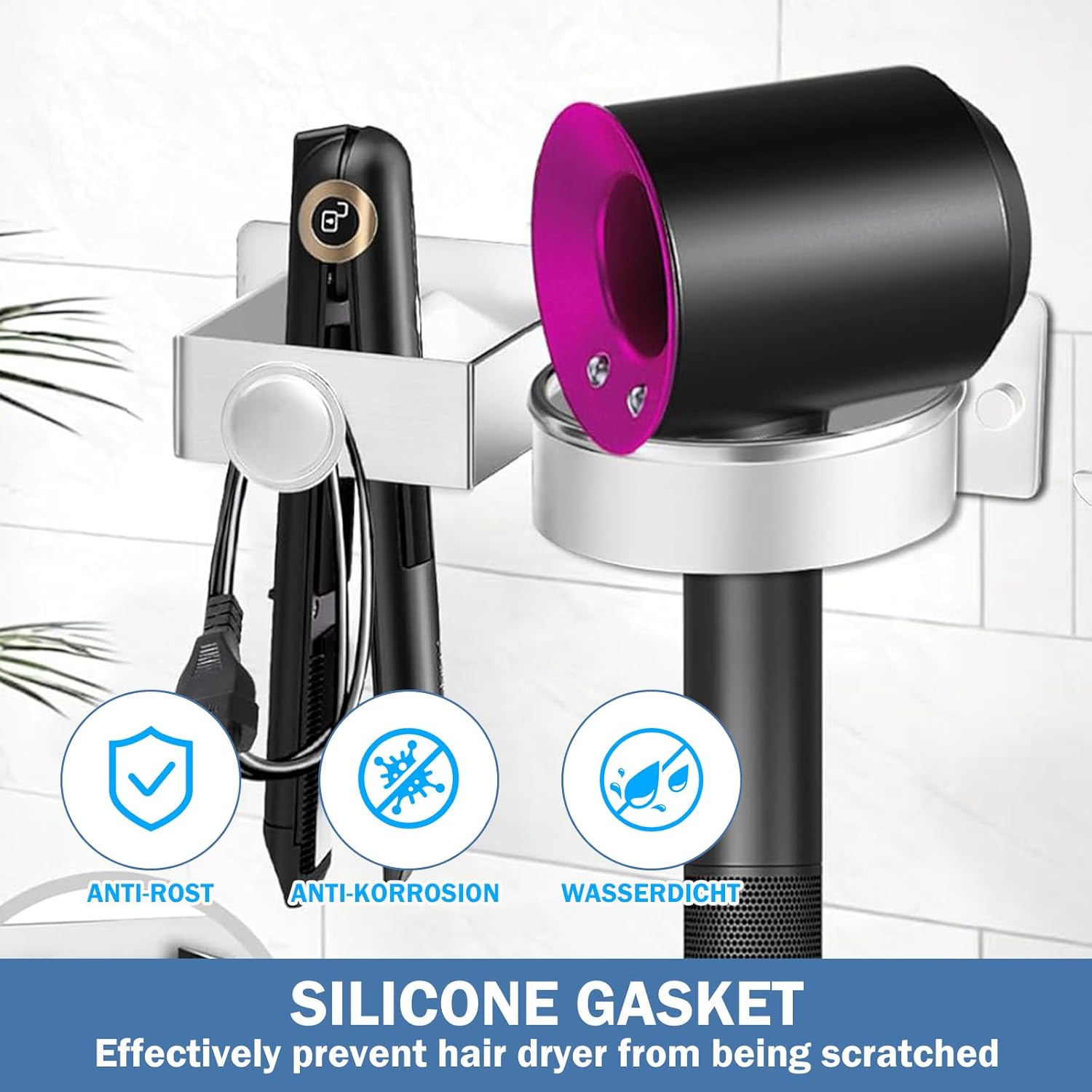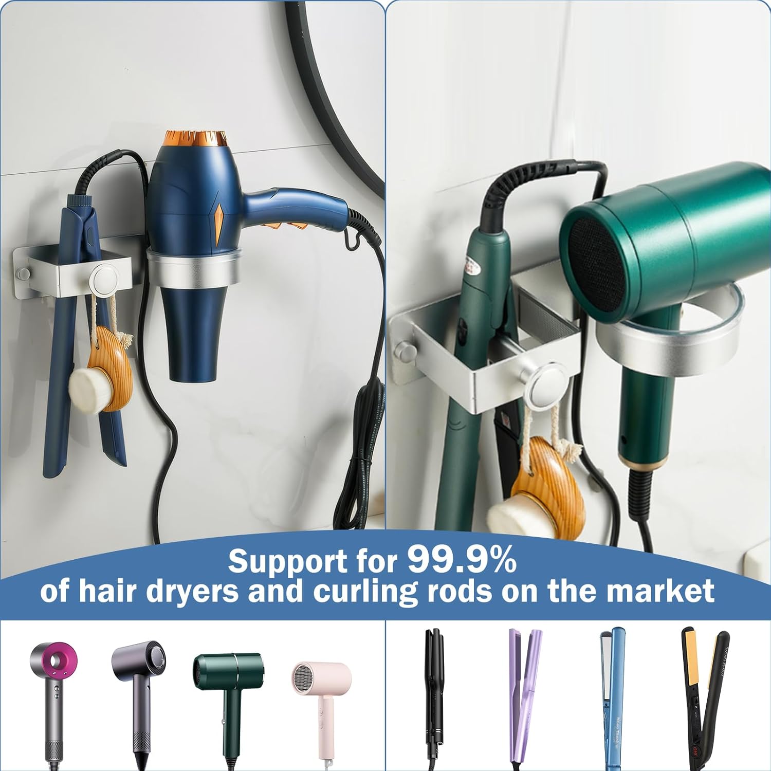 Ce support est conçu pour s’adapter à la majorité des sèche-cheveux, quel que soit leur modèle ou taille. De plus, il est doté d’un coussin en silicone qui protège votre appareil des rayures et des dommages.