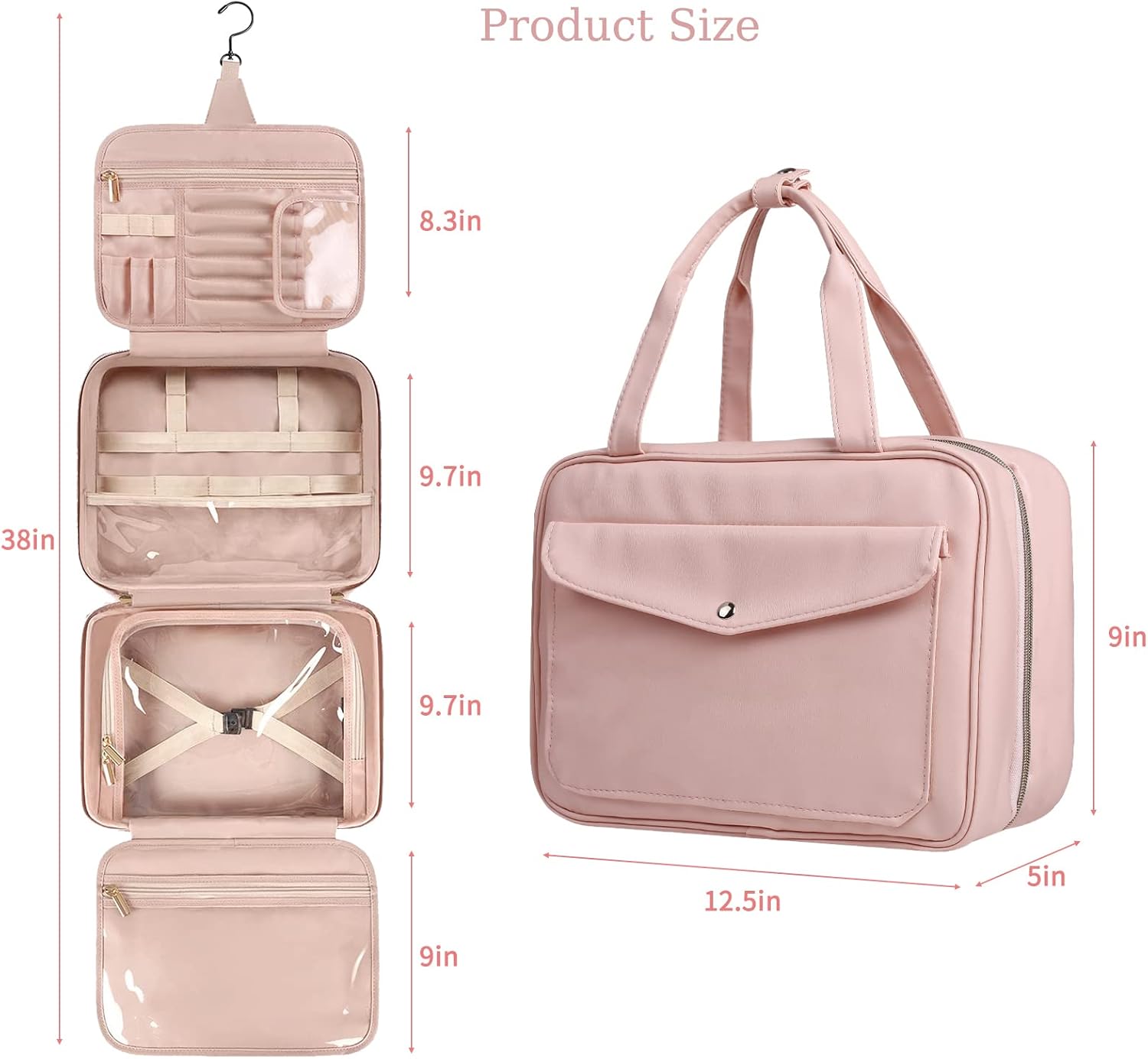 Cette trousse est équipée d’un crochet métallique pivotant à 360 degrés, permettant de la suspendre facilement dans la salle de bain ou à l’armoire. Veillez simplement à ne pas charger d’objets trop lourds pour préserver la structure de l’accessoire.