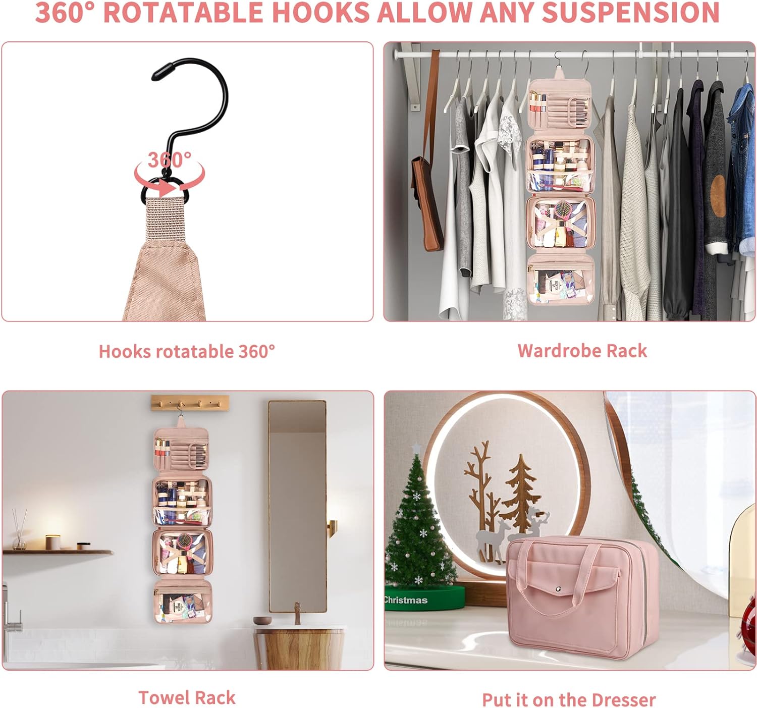 Réponse : Oui, elle est équipée d’un crochet pivotant à 360°, facilitant son accrochage dans la salle de bain ou dans une armoire. - Question : Est-ce que cette trousse est adaptée pour les voyages ?