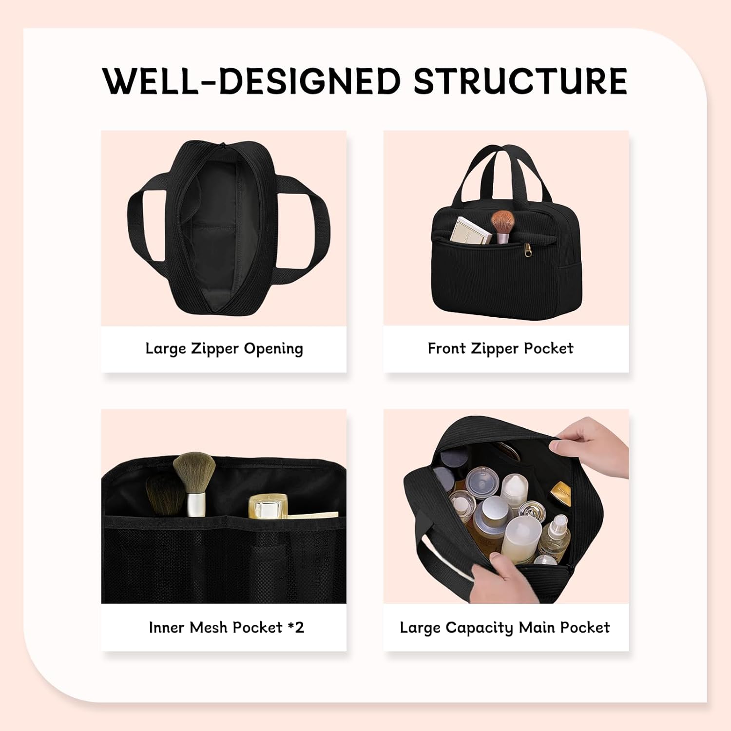 - Séparation en grille intérieure : permet de ranger vos cosmétiques et articles de toilette de manière ordonnée.